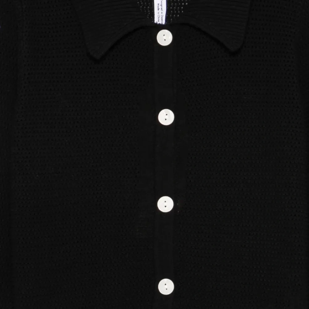 черный ажурный джемпер с застежкой на пуговицы, длинными рукавами, воротником поло и фактурной резинкой по краю