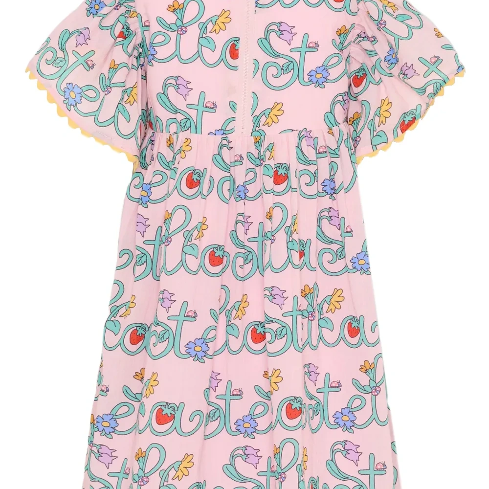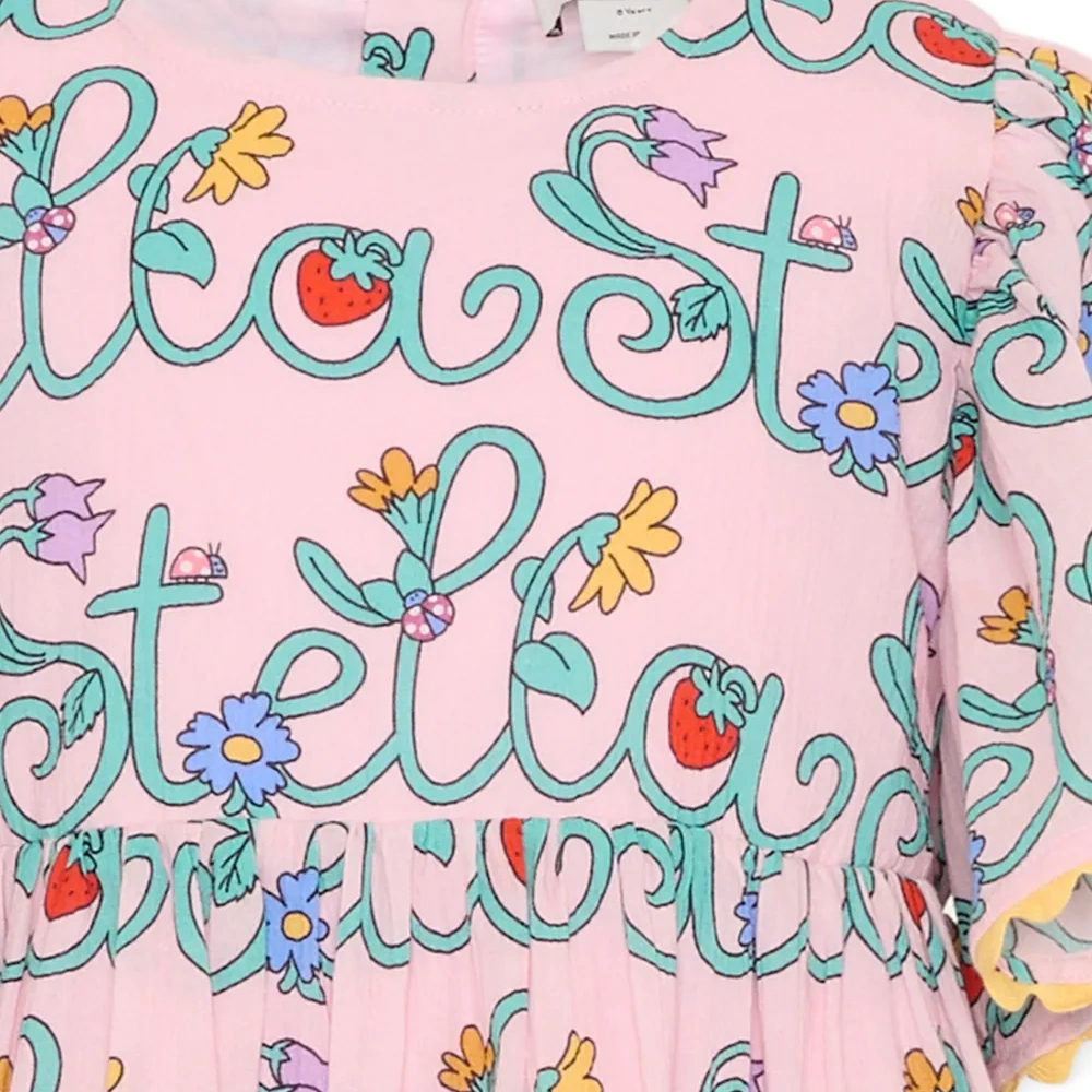 розовое и многоцветное платье с цветочным принтом, короткими рукавами, отделкой рюшами, застёжкой-молнией сзади и круглым вырезом
