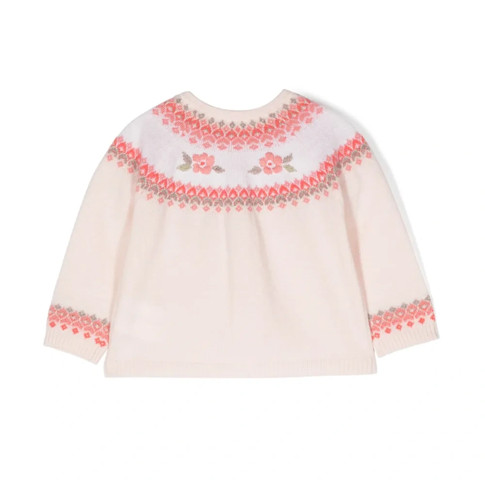 Светло-розовый, смесовая шерсть, вышитый узор, круглый вырез, застежка на пуговицах спереди, длинные рукава и прямой подол.