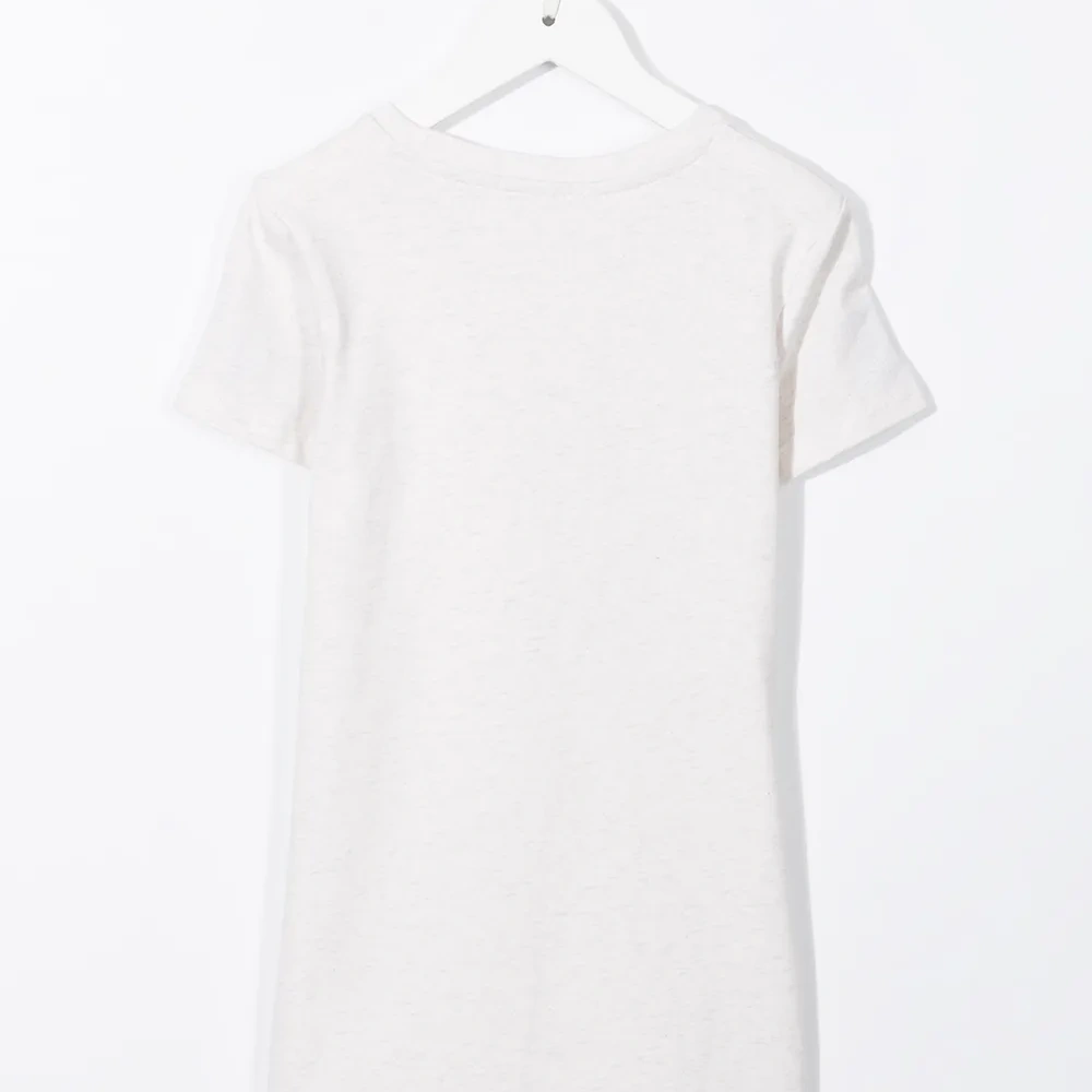 Логотип спереди, круглый вырез, короткие рукава и прямой подол.