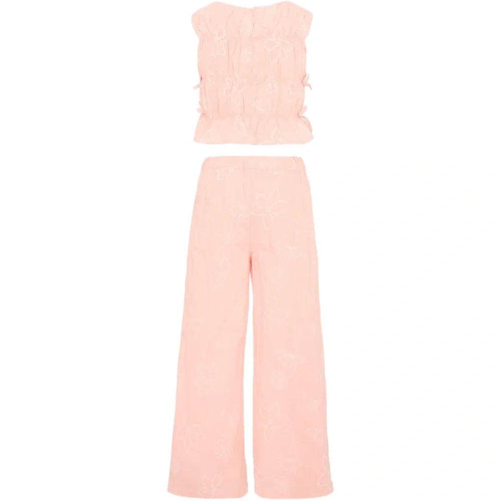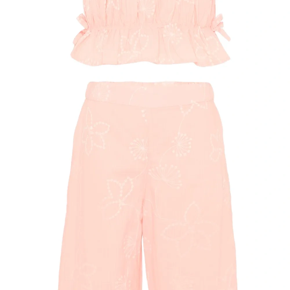 розовая ткань с цветочной вышивкой, оборками, бантиками, круглым вырезом, без рукавов, широкими штанинами