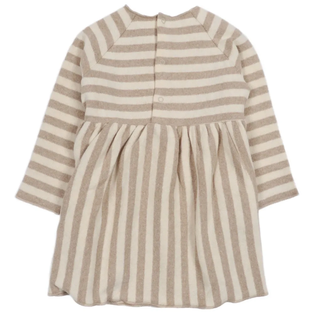 бежевый в полоску длинные рукава круглый вырез собранная юбка застежка на пуговицы