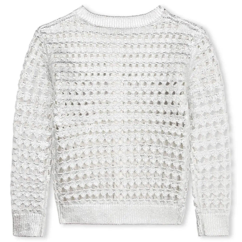 Серебристый, органический хлопок, эффект металлик, ажурная вязка, отделка в рубчик, круглый вырез, застежка на пуговицах спереди, длинные рукава и прямой подол. Узнать больше о том, какие товары получают отметку «Ответственный выбор», можно из материала «Как мы оцениваем экологичность и этичность».