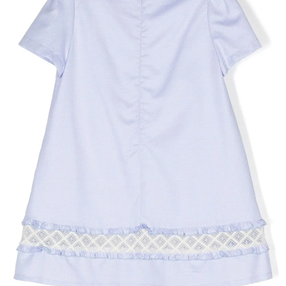 Сиренево-голубой, хлопок, парусина, вставки из кружева, круглый вырез, короткие рукава, застежка на молнии сзади и волнистые края.