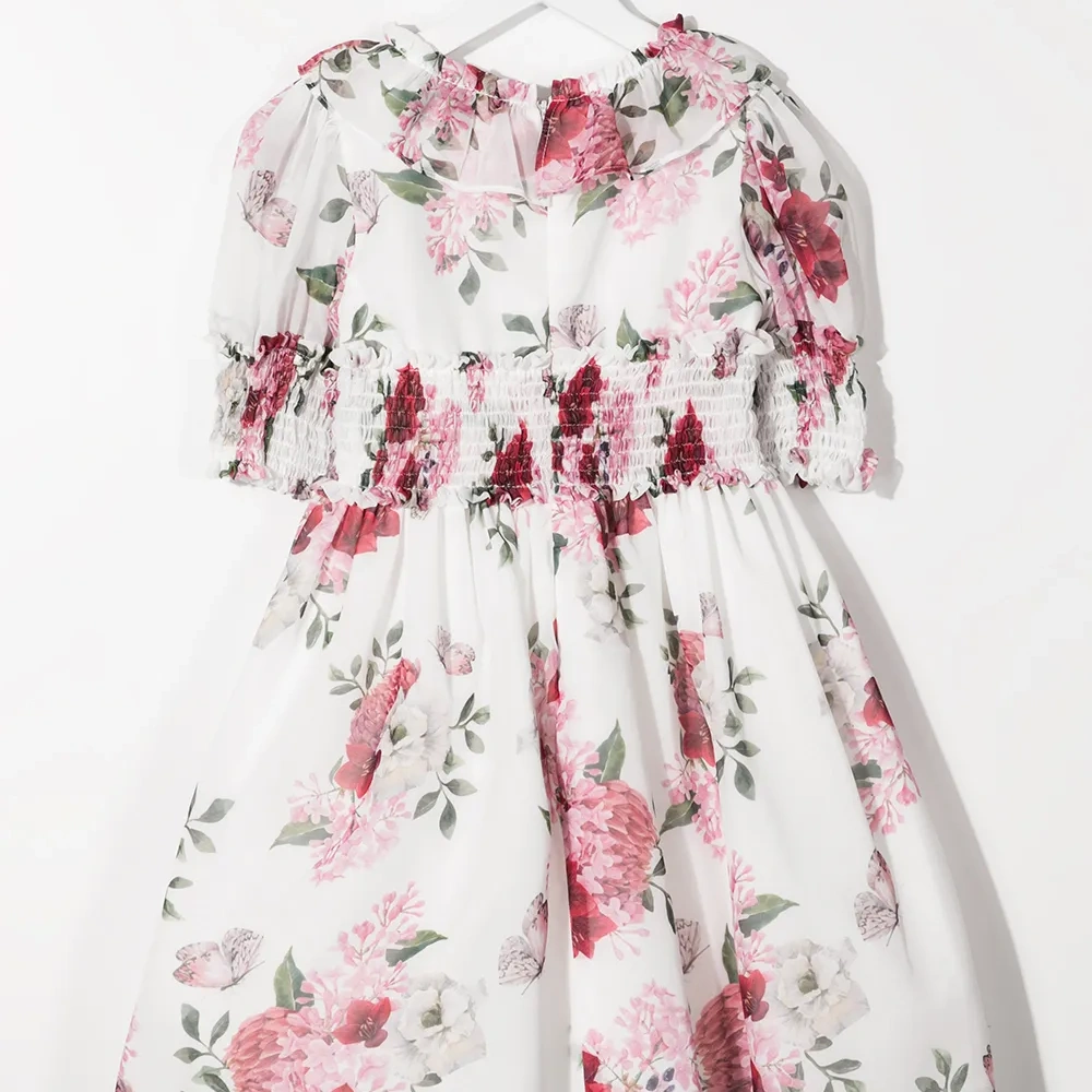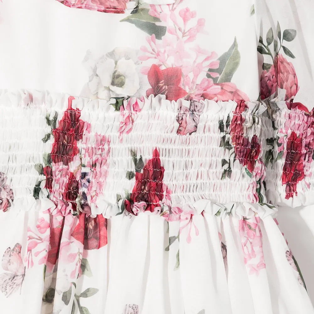 Сплошной цветочный принт, круглый вырез, отделка с оборками, короткие рукава и сборка на талии.