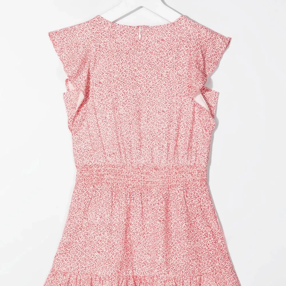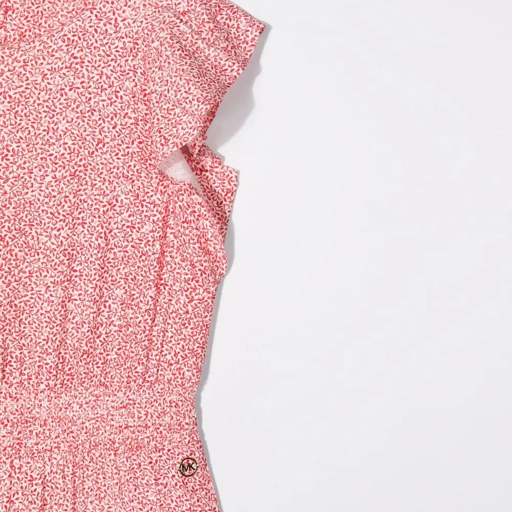 Сплошной цветочный принт, вставки с оборками, металлический логотип, эластичный пояс, круглый вырез и рукава кап.