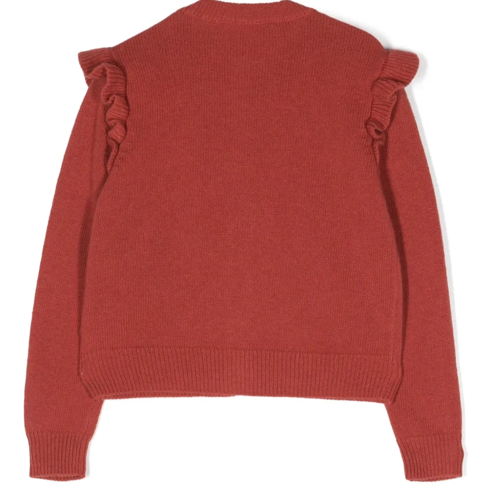 Темно-оранжевый, необработанная шерсть, фактурная вязка, вставки с оборками, помпоны, круглый вырез, длинные рукава, застежка на пуговицах спереди и прямой подол.