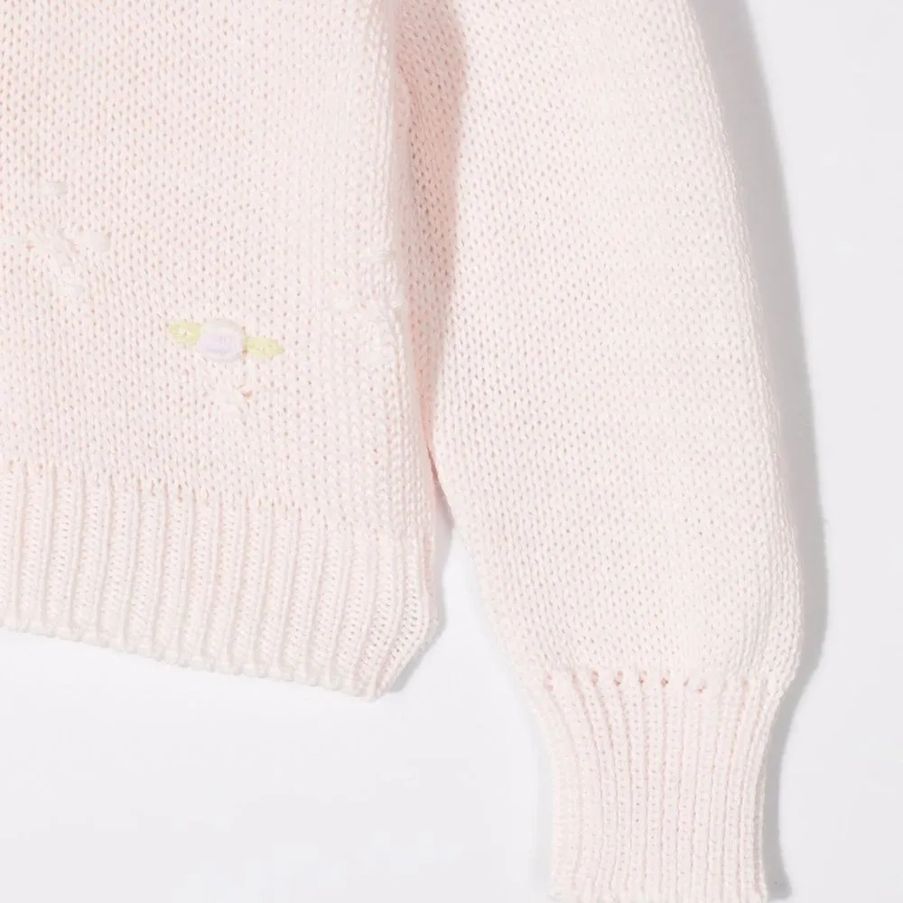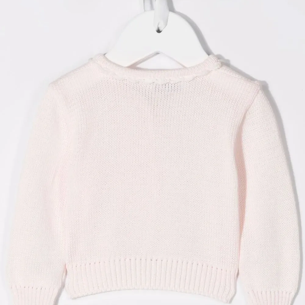Вышивка, края в рубчик, трикотажный материал, круглый вырез, застежка на пуговицах спереди и длинные рукава.