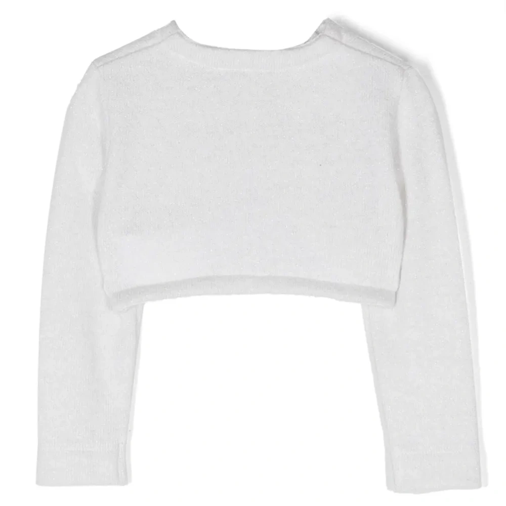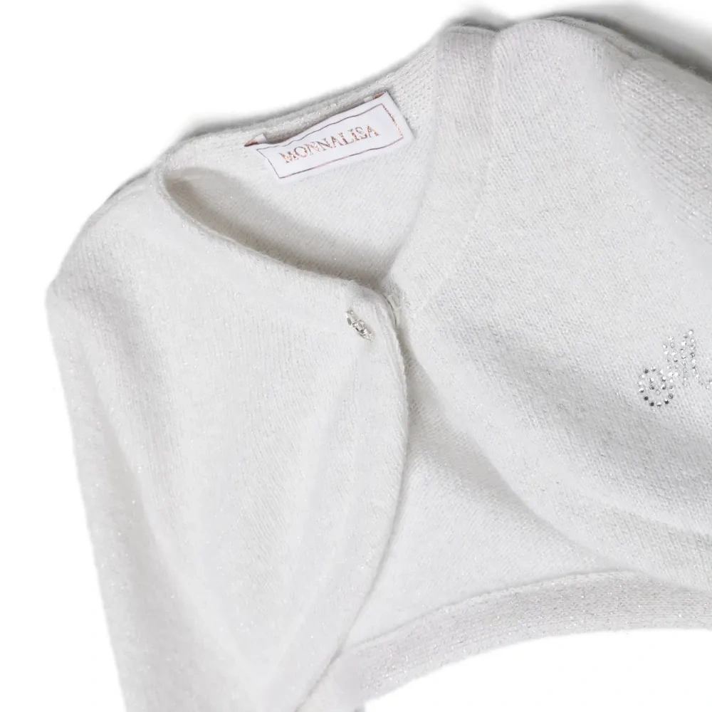 Бежевый, смесовая шерсть, трикотажный материал, украшения из горного хрусталя, круглый вырез, застежка на пуговицах спереди, длинные рукава и укороченная длина.