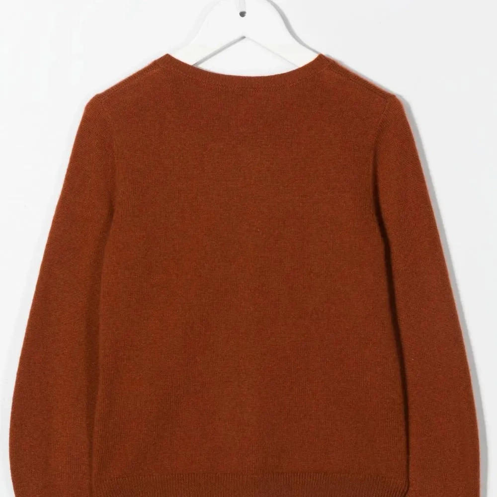 Оранжевый, кашемир, круглый вырез, застежка на пуговицах спереди, длинные рукава и подол в рубчик.