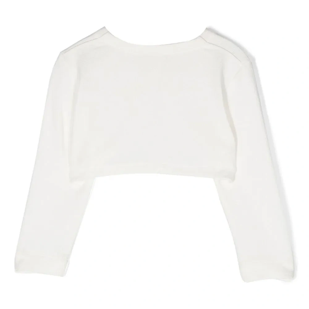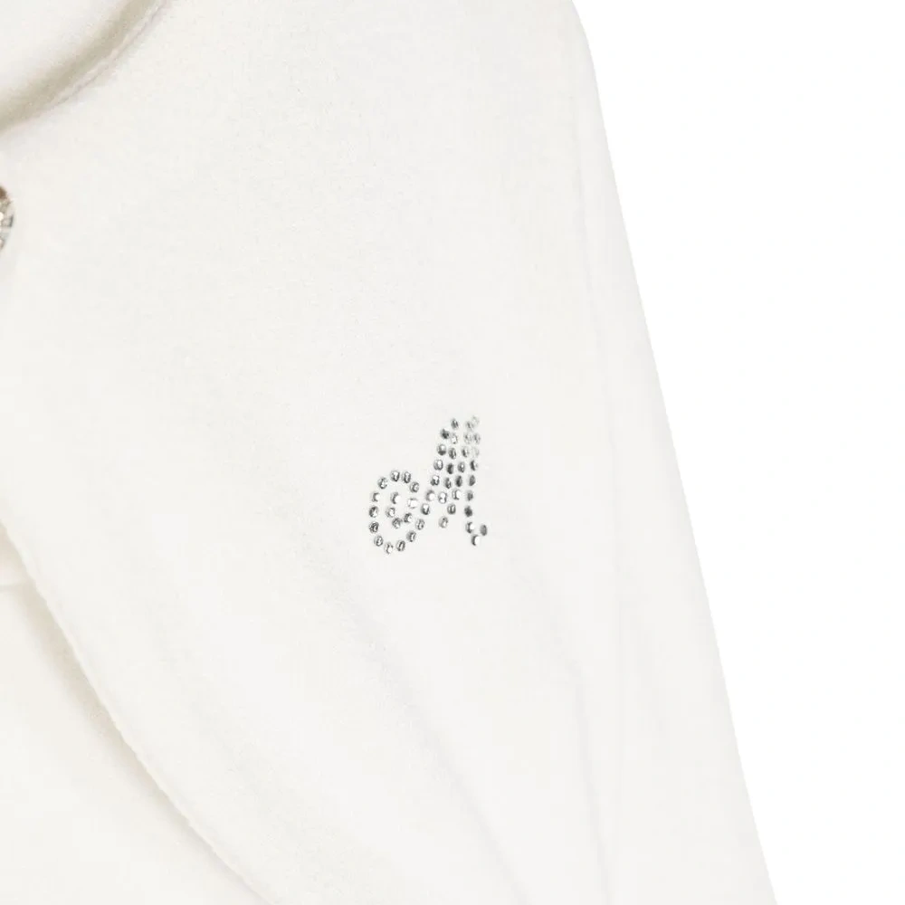 Белый, укороченная длина, украшения из горного хрусталя, пуговицы в форме сердца, круглый вырез, застежка на пуговицах спереди и длинные рукава.