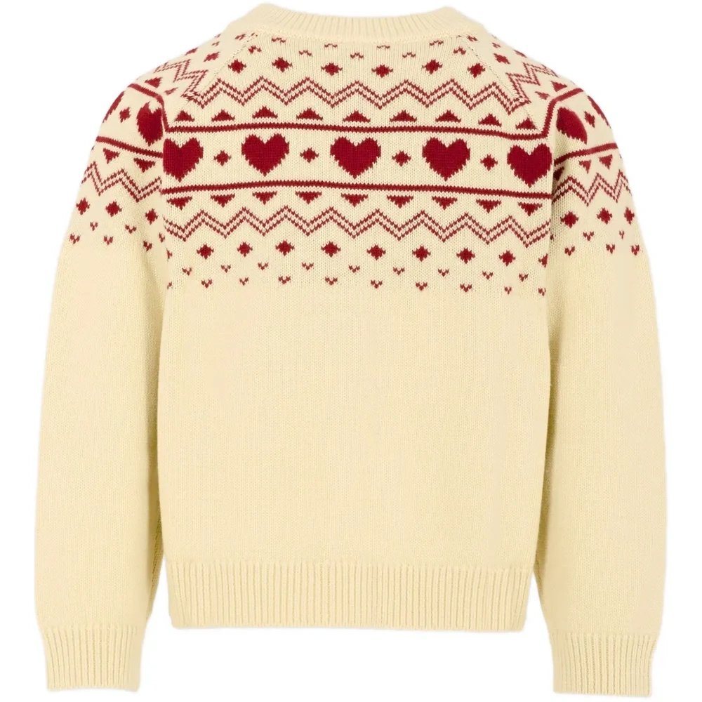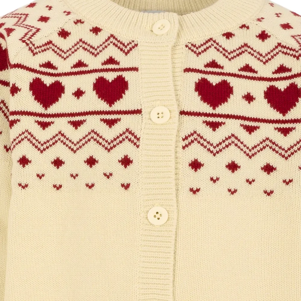 сливочно-белый джемпер с узором в виде сердец, круглым вырезом, застёжкой на пуговицы спереди, длинными рукавами и ребристым низом