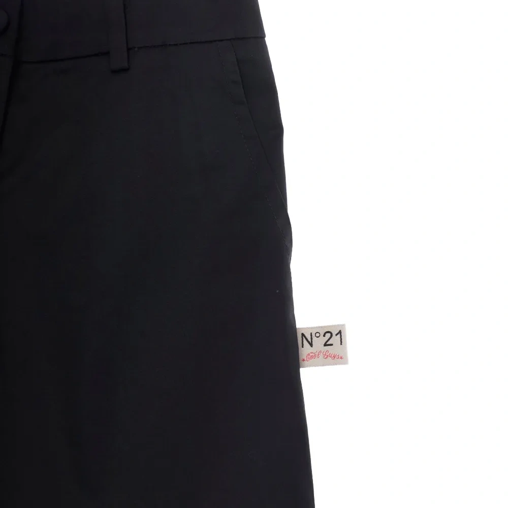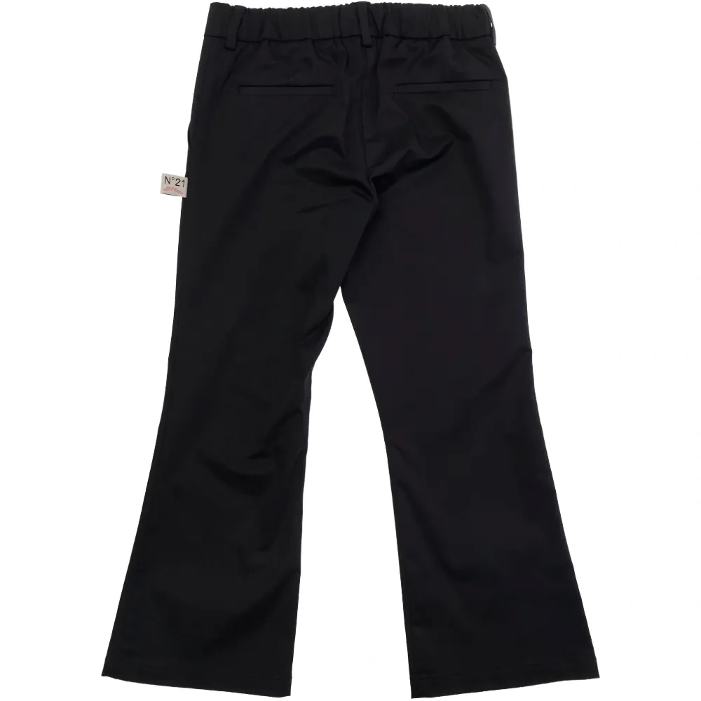 чёрные брюки с застёжкой на пуговицы, шлёвками для ремня, боковыми карманами и эластичным поясом сзади