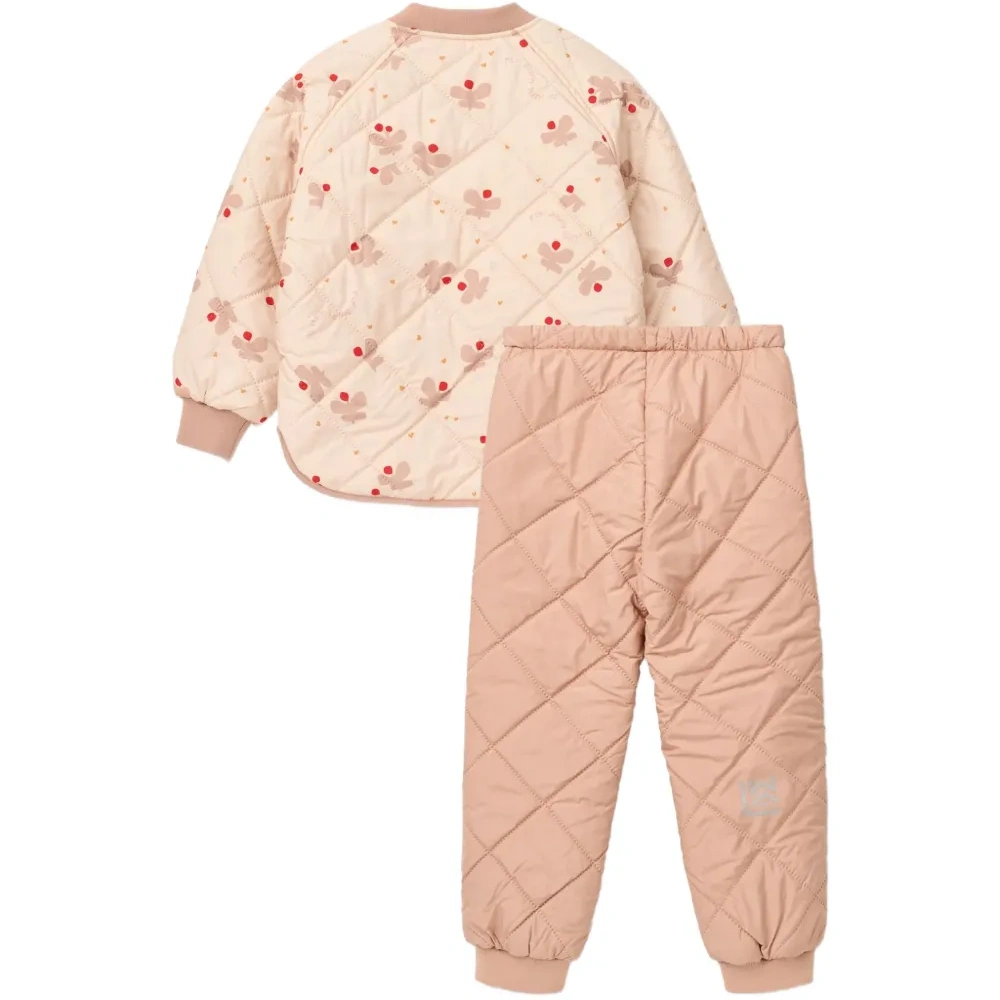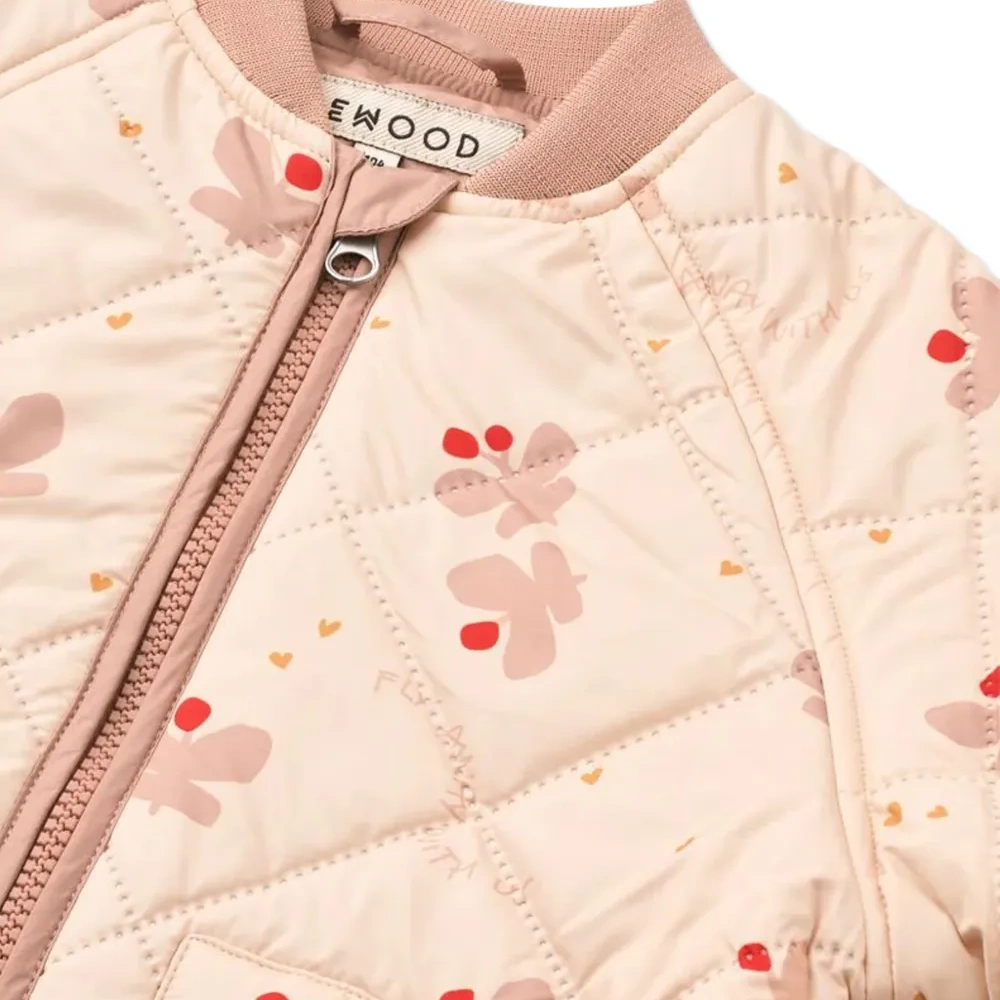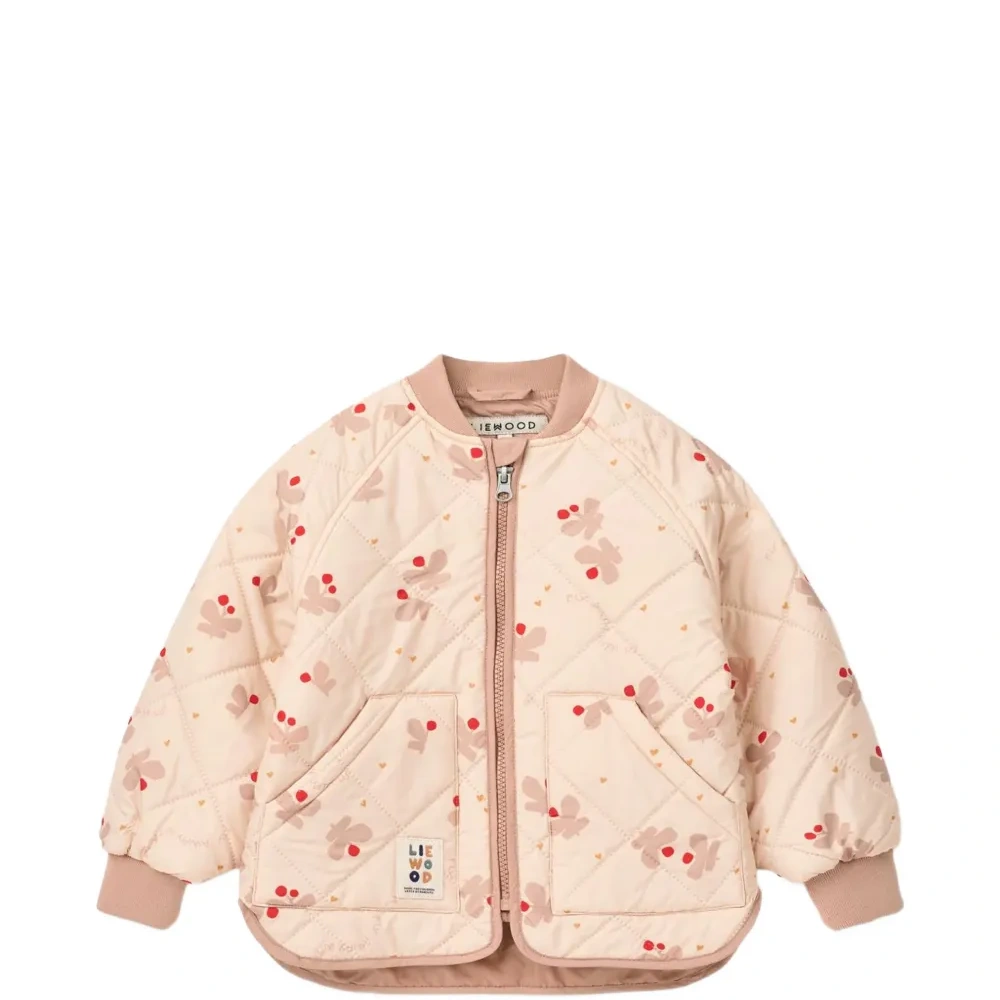светло-розовый стеганый материал, застежка-молния, длинные рукава, ребристые края