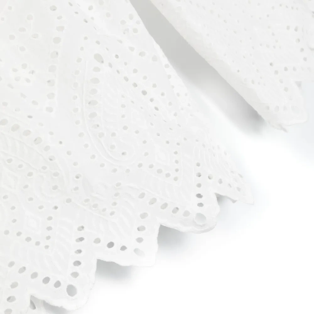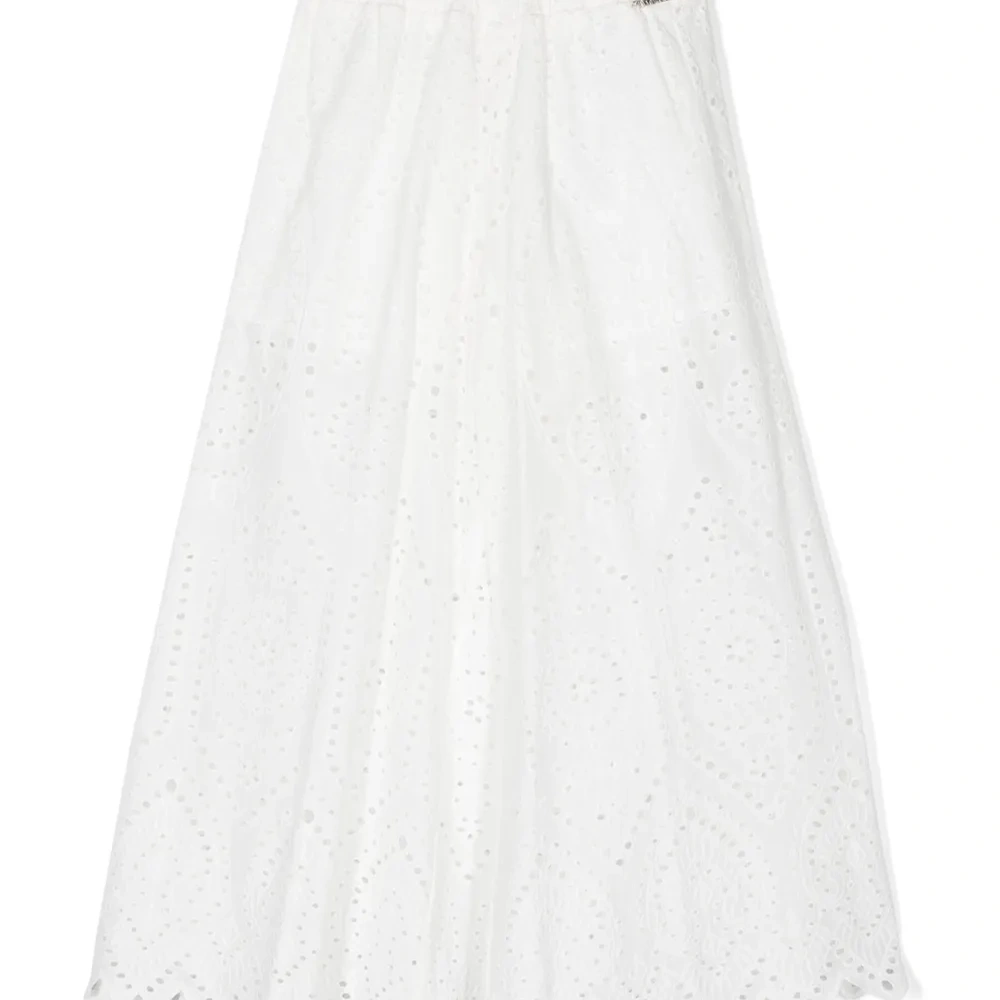 Белый, хлопок, серебристый металлический логотип, расклешенный крой, отделка с вырезами, сборка на талии и укороченная длина.