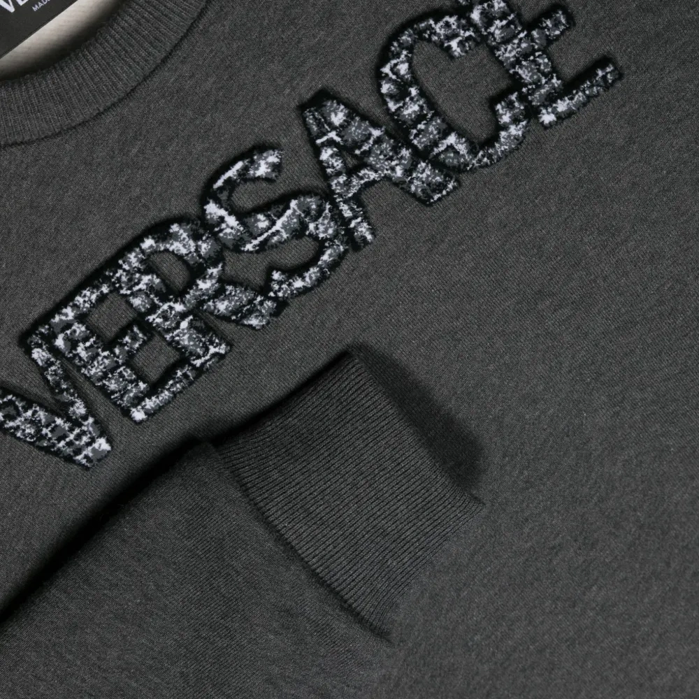 Серый, смесовый хлопок, логотип-аппликация, круглый вырез, длинные рукава, прямой подол и отделка в рубчик.
