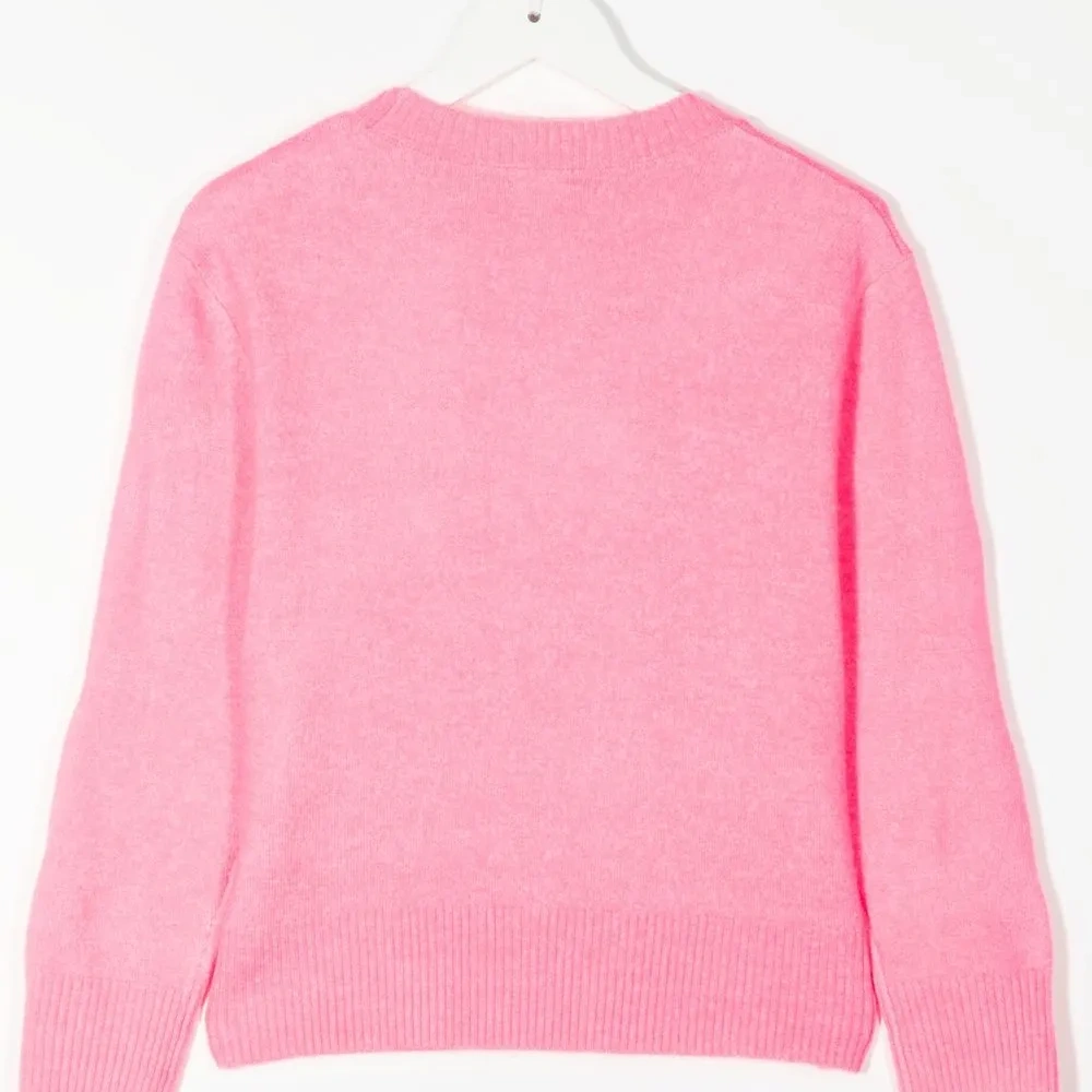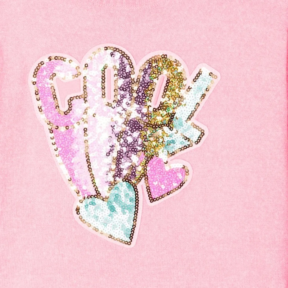 Розовый, трикотажный материал, украшение из пайеток, круглый вырез, длинные рукава, прямой подол и отделка в рубчик.
