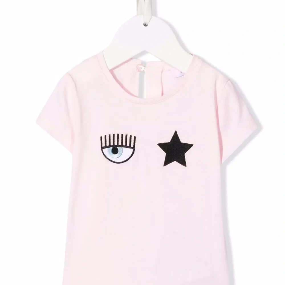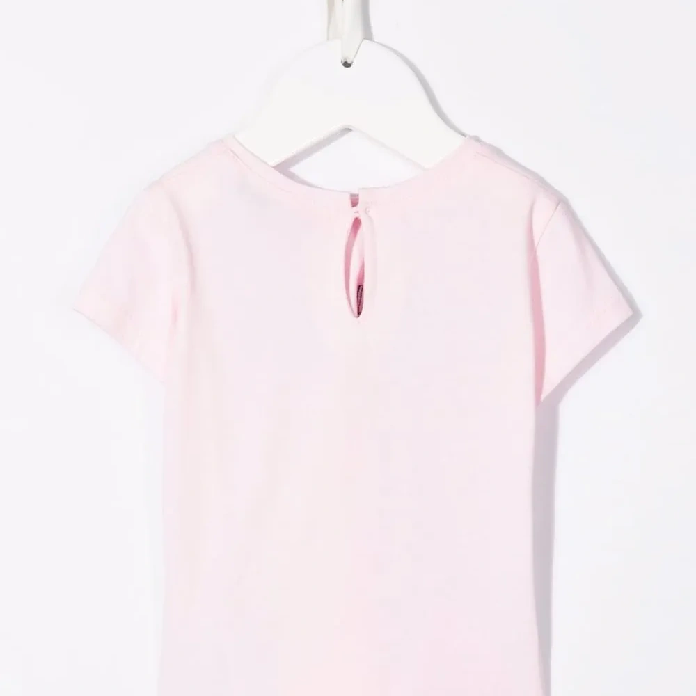 Логотип спереди, круглый вырез, короткие рукава и прямой подол.