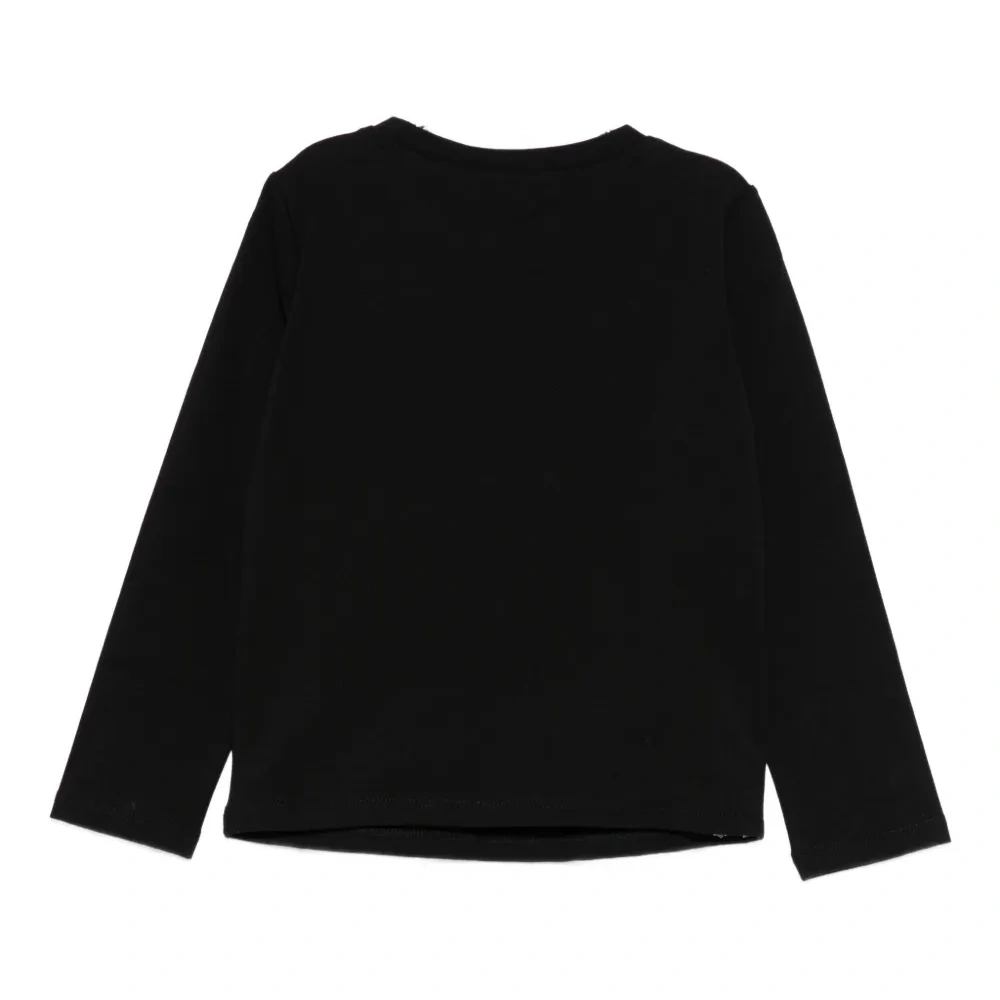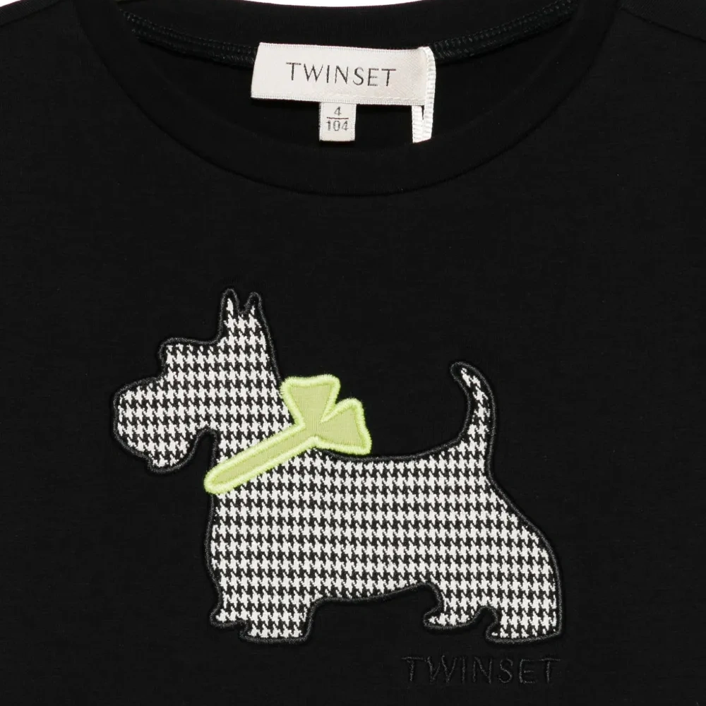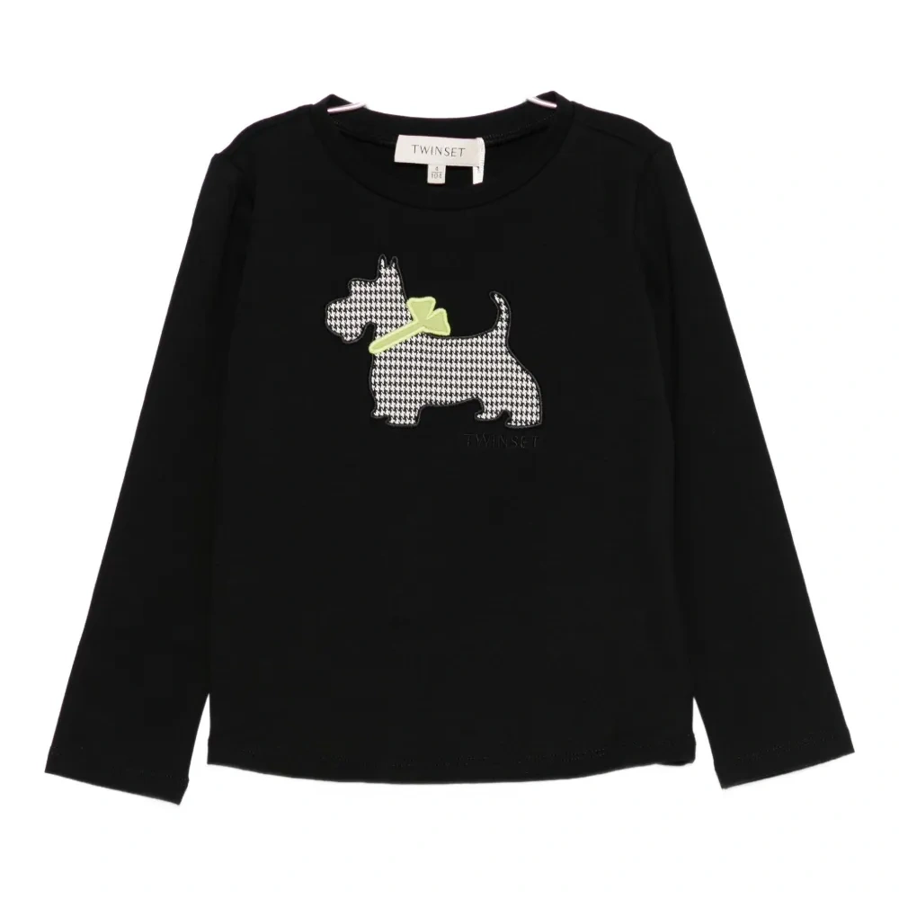 черная футболка с аппликацией в виде собаки в узоре "гусиная лапка", длинные рукава, круглый вырез