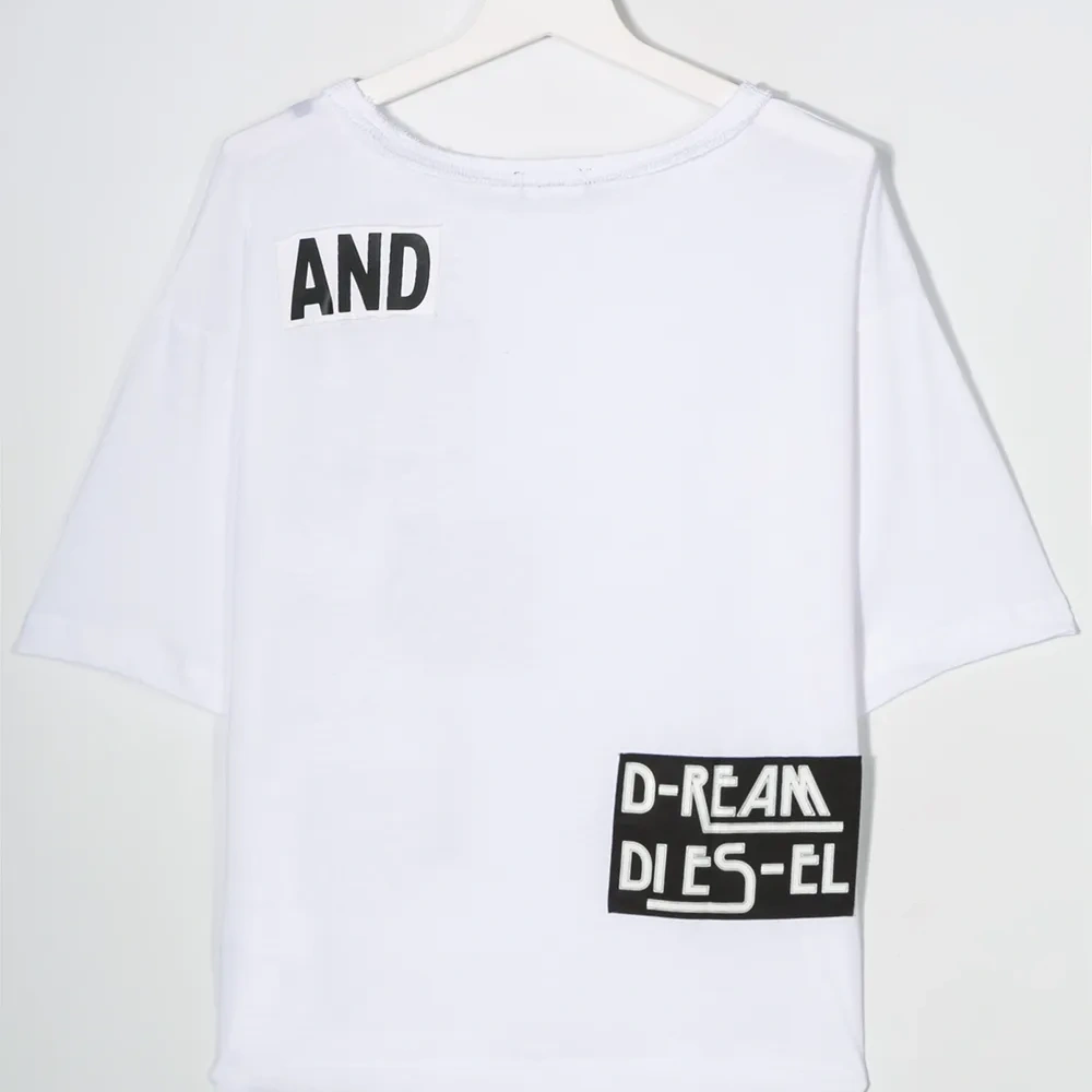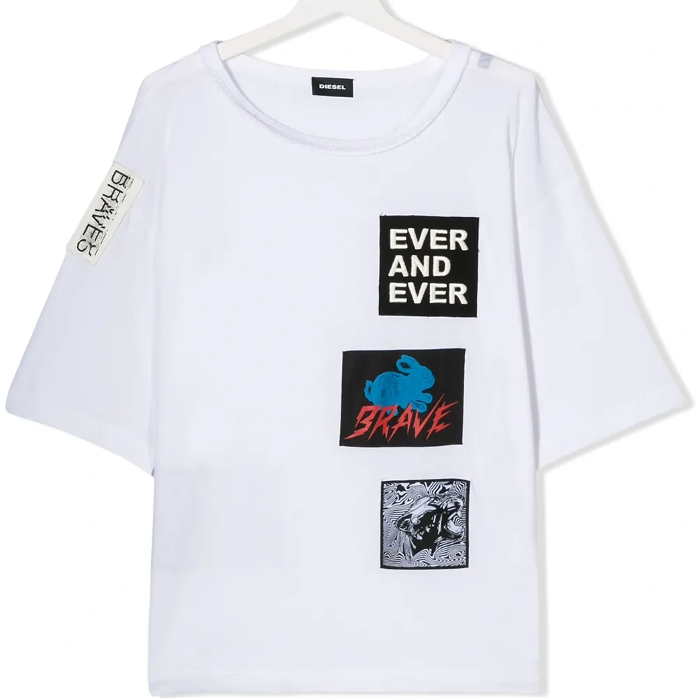 Футболка с вышивкой от Diesel Kids. Свободный крой, графический принт, круглый вырез под горло с окантовкой, короткие рукава и прямой подол. Цвет: белый.