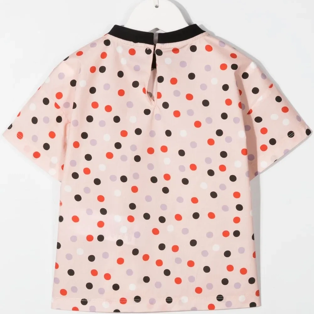 Принт в горох, принт с логотипом FF, круглый вырез, застежка на пуговицы сзади, короткие рукава и прямой подол.