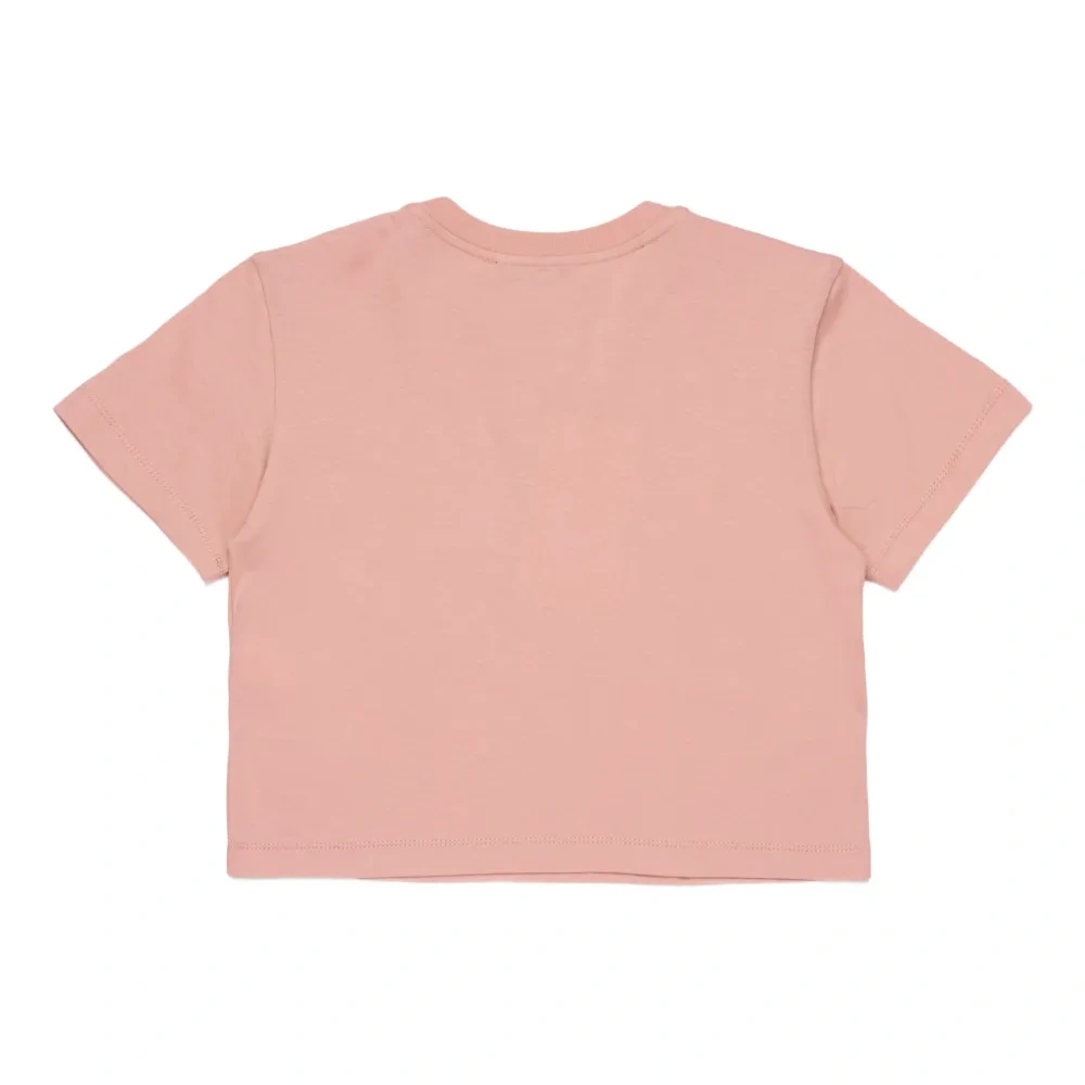 розовая футболка с круглым вырезом, короткими рукавами и принтом-логотипом