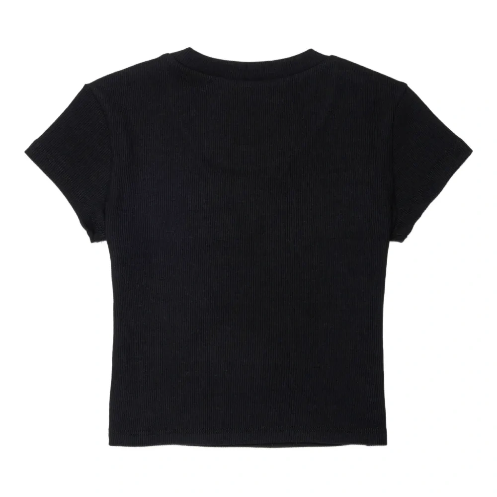 черная футболка с принтом-логотипом, круглым вырезом и короткими рукавами