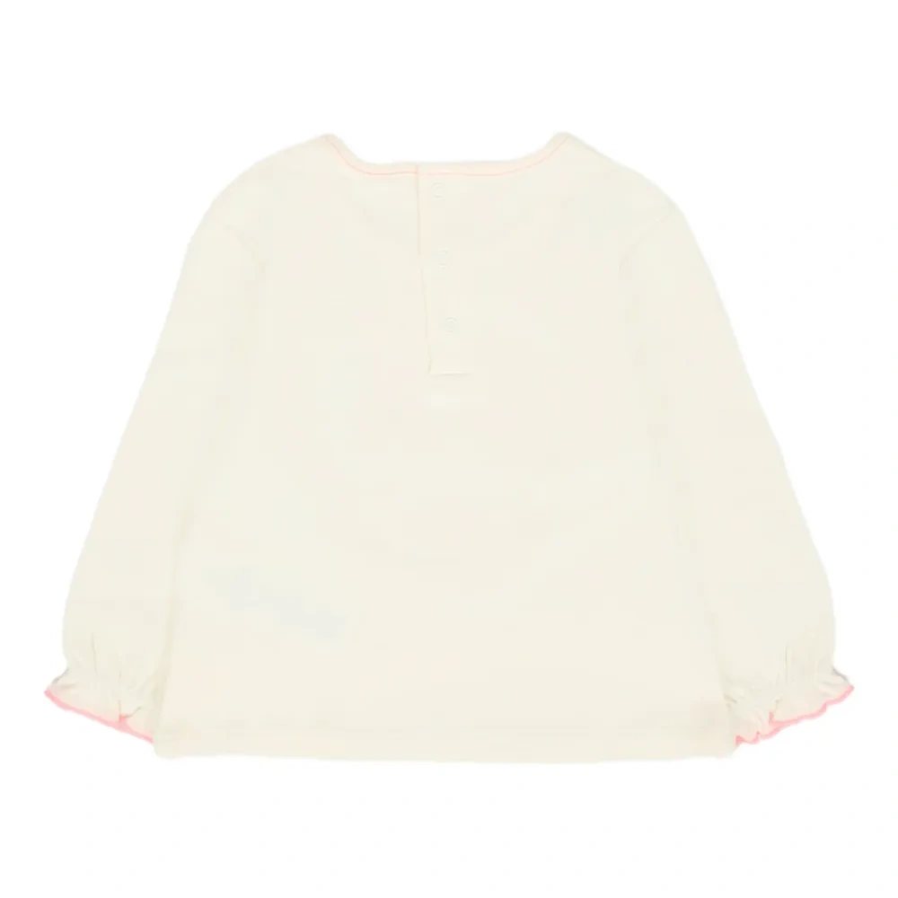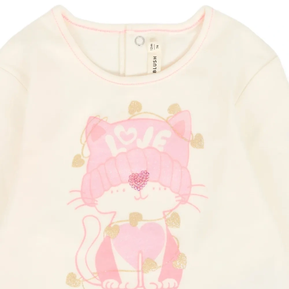 слоново-костюмовая блуза с принтом кошки, длинными рукавами, оборками на манжетах, круглым вырезом и золотистой отделкой