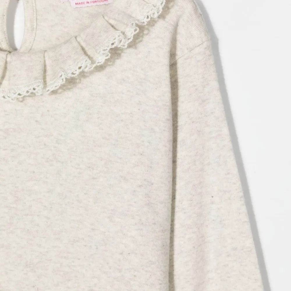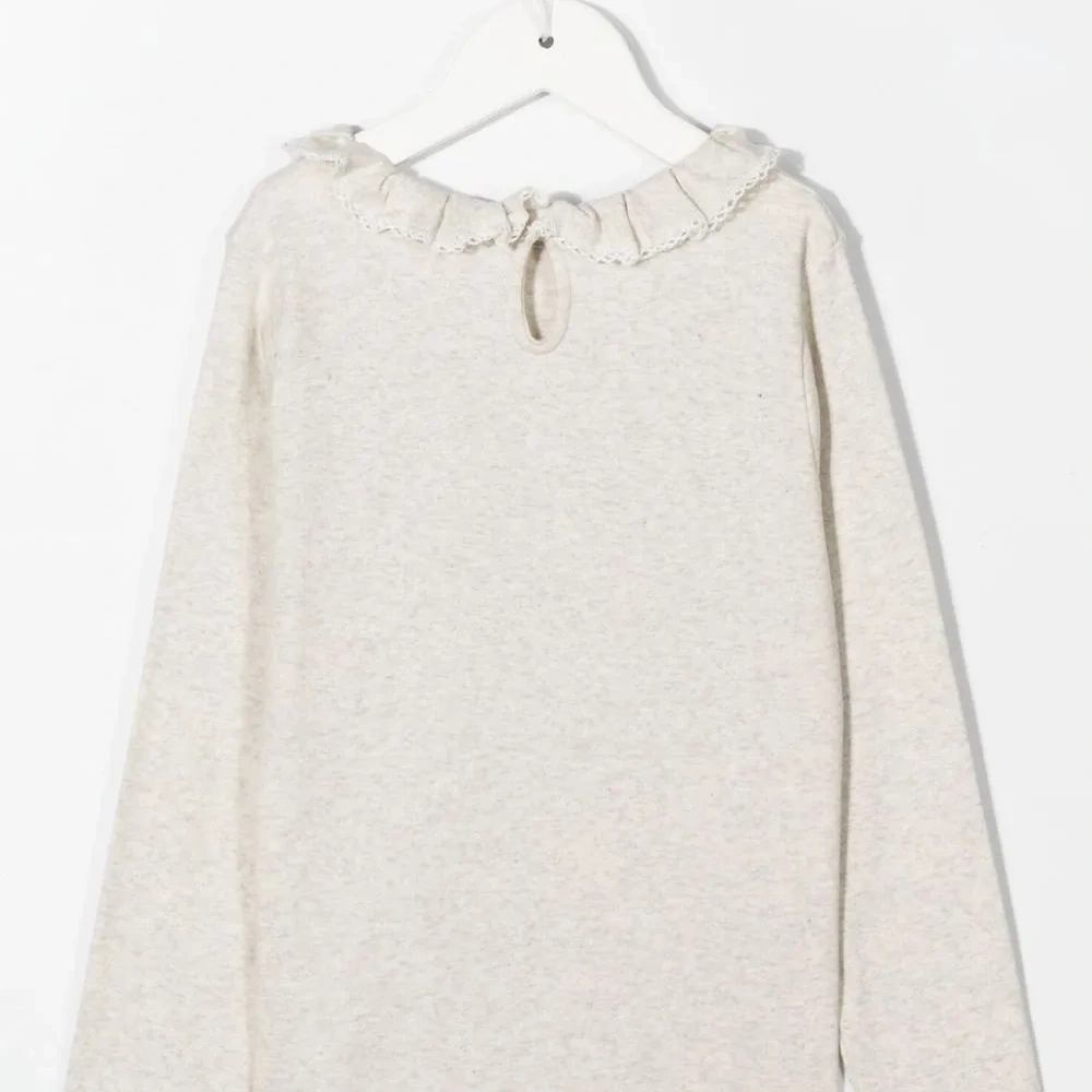 Светло-серый, хлопок, воротник с оборками, застежка на пуговицы сзади, длинные рукава и прямой подол.