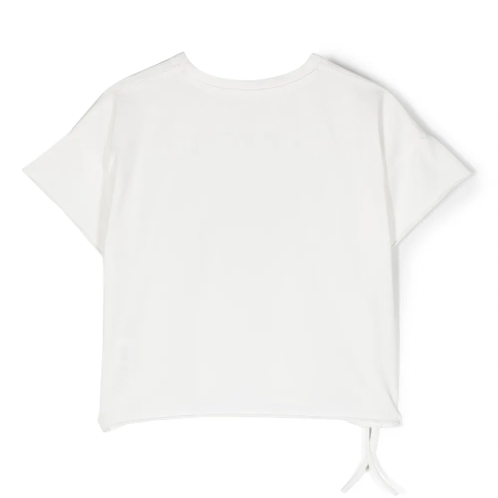 Кремовый, стрейчевый органический хлопок, принт с надписью спереди, круглый вырез, короткие рукава, завязки по бокам и необработанный подол. Узнать больше о том, какие товары получают отметку «Ответственный выбор», можно из материала «Как мы оцениваем экологичность и этичность».