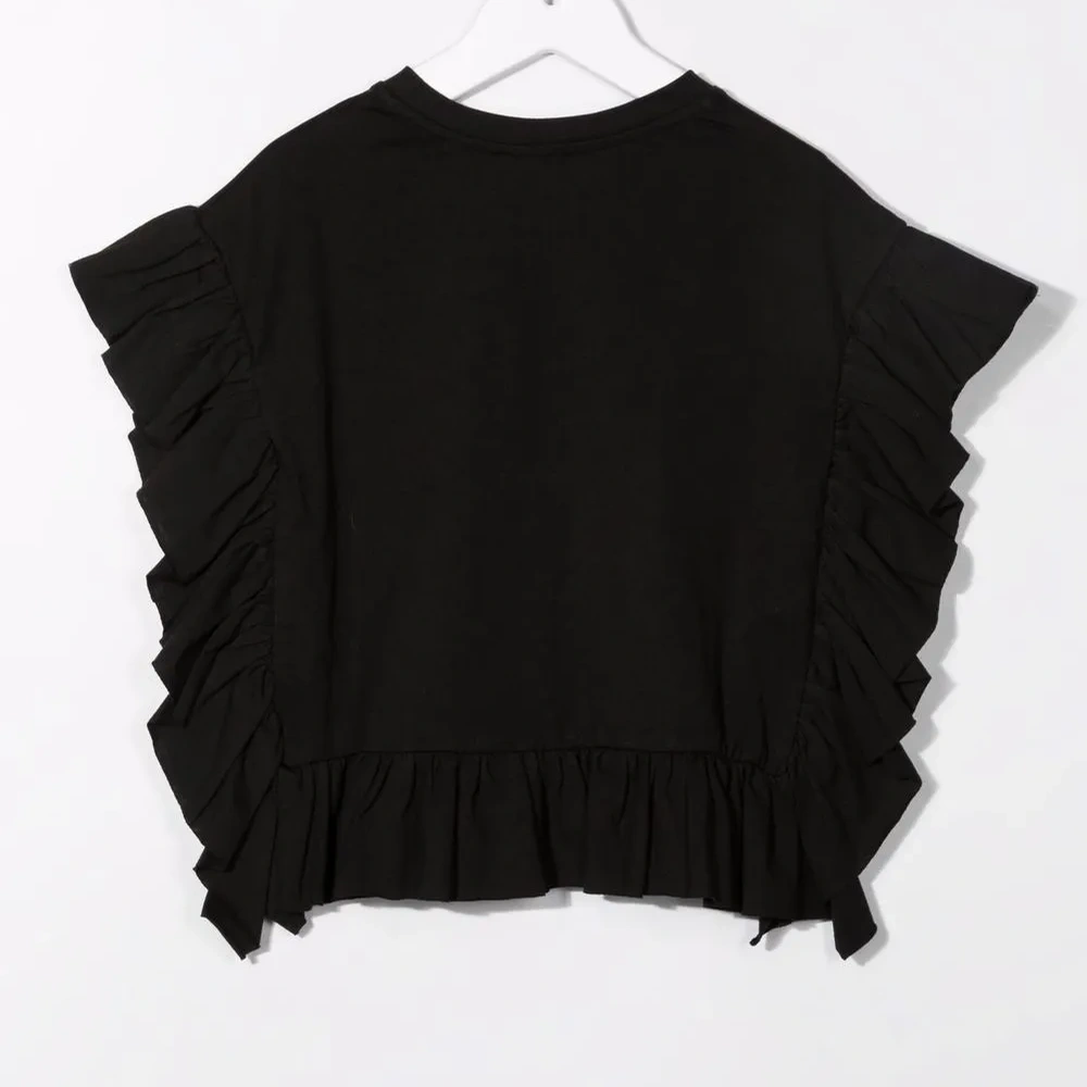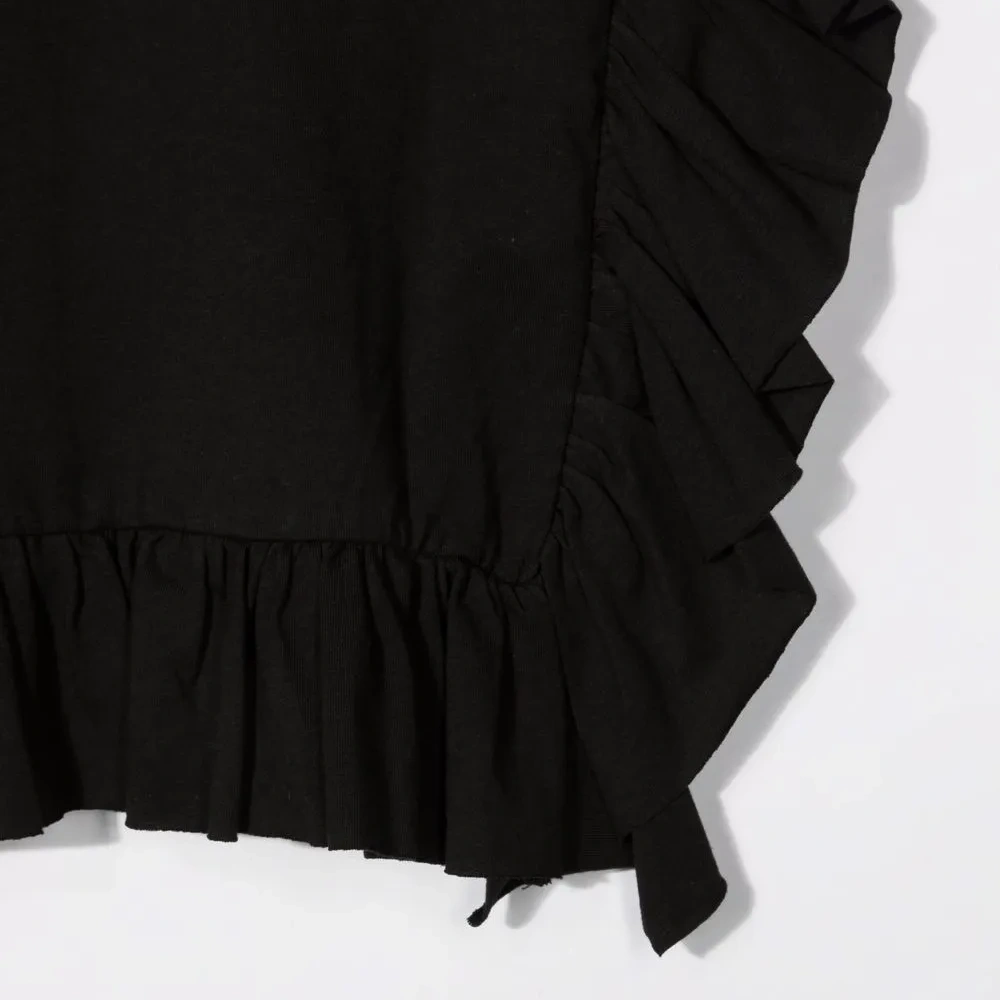 Вставки с оборками, круглый вырез, короткие рукава и прямой подол.