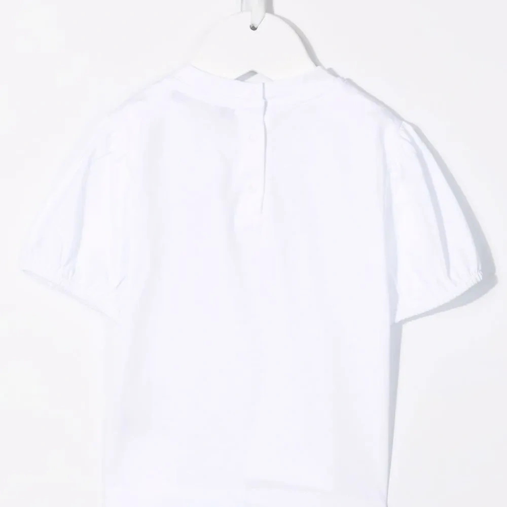 Логотип спереди, круглый вырез, застежка на пуговицы сзади, короткие рукава и прямой подол.