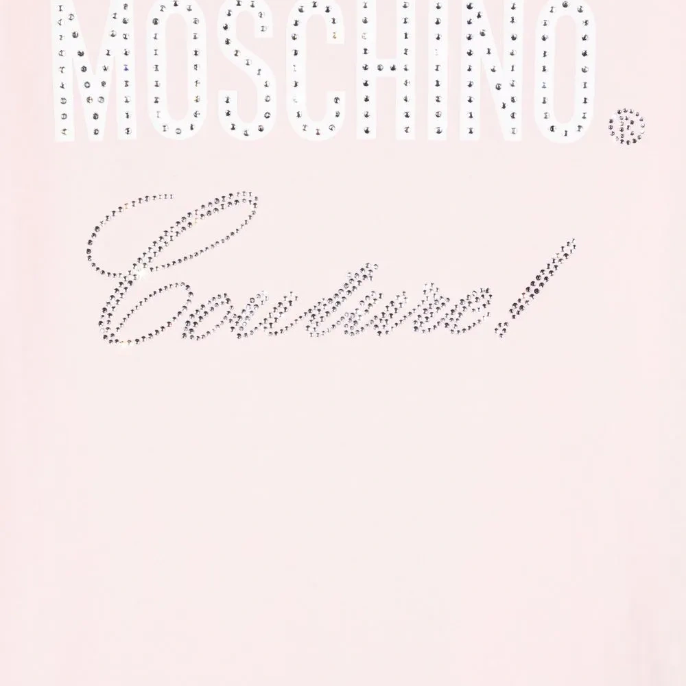 Украшения из горного хрусталя, логотип спереди, круглый вырез, короткие рукава и прямой подол. Цвет: розовый.