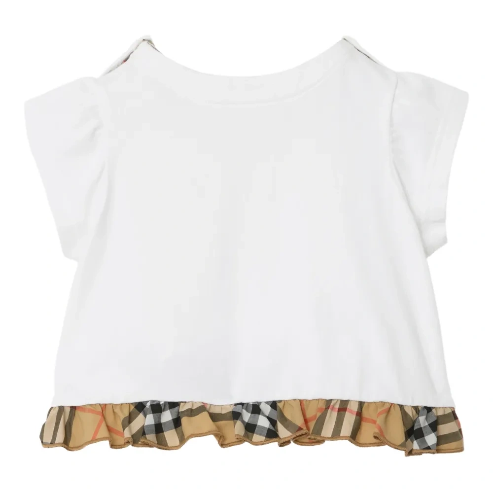белая футболка с круглым вырезом, короткими рукавами, оборками и в клетку
