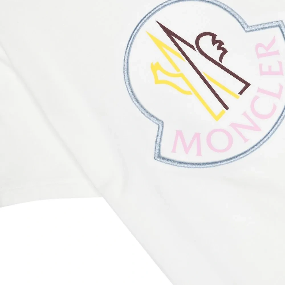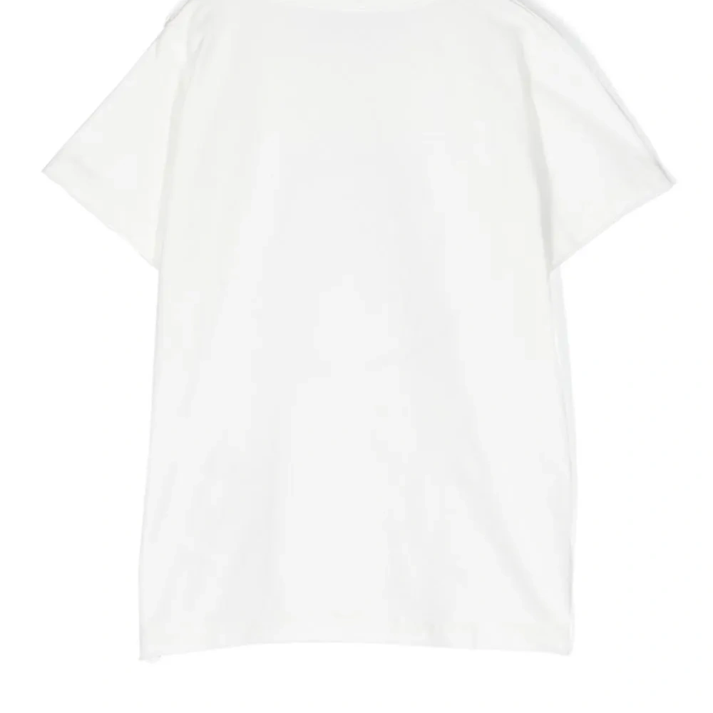 Белый, эластичный хлопок, нашивка с логотипом спереди, круглый вырез, короткие рукава и прямой подол.