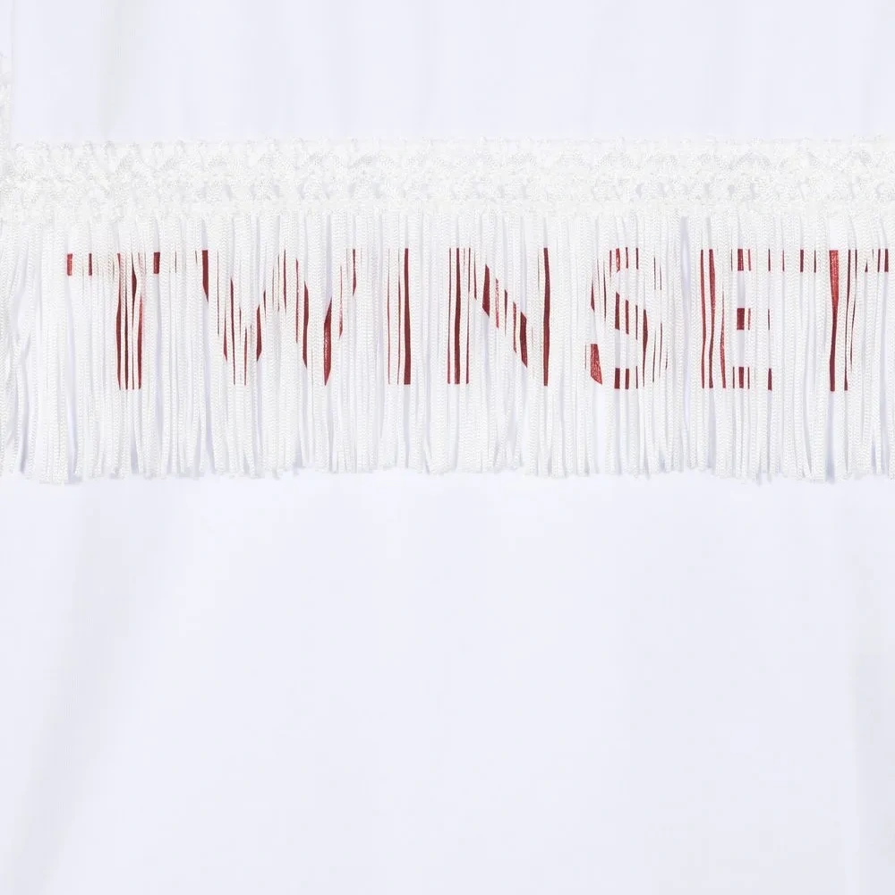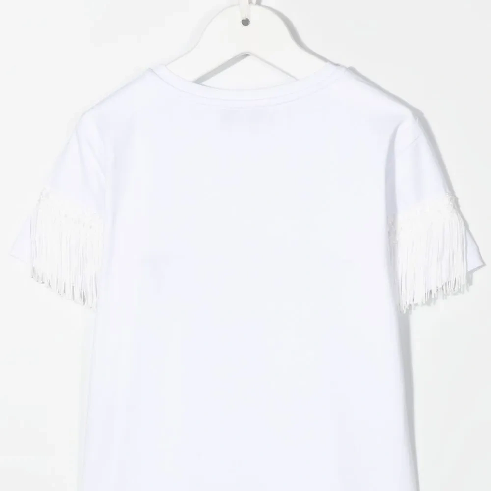 Белый, бахрома, логотип спереди, круглый вырез, короткие рукава и прямой подол.