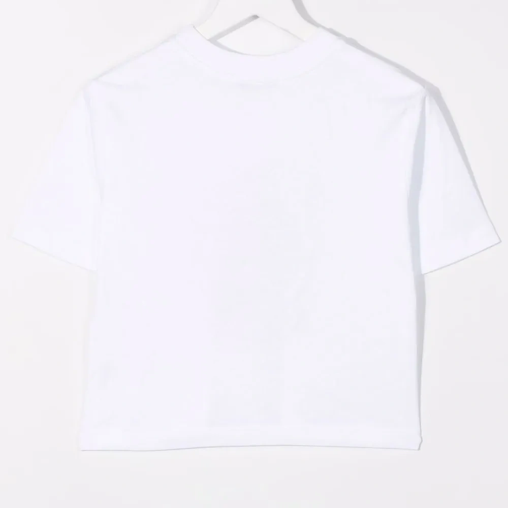 Логотип спереди, круглый вырез, короткие рукава и прямой подол. Цвет: белый.