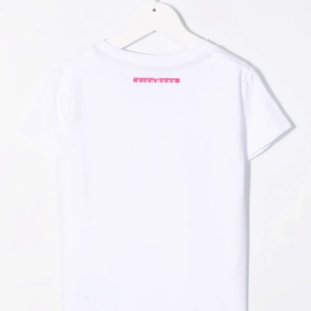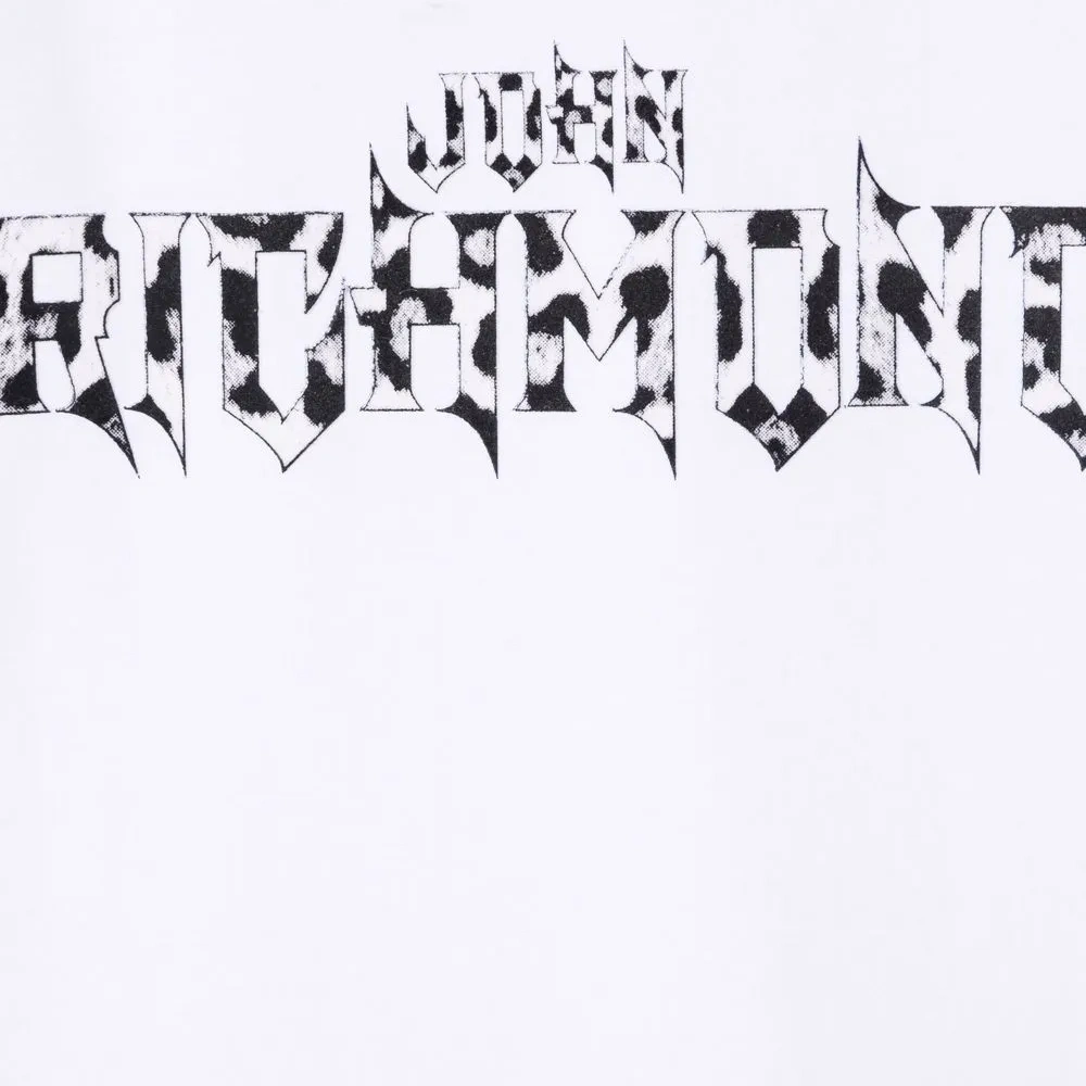 Логотип спереди, коровий принт, круглый вырез, короткие рукава и прямой подол.