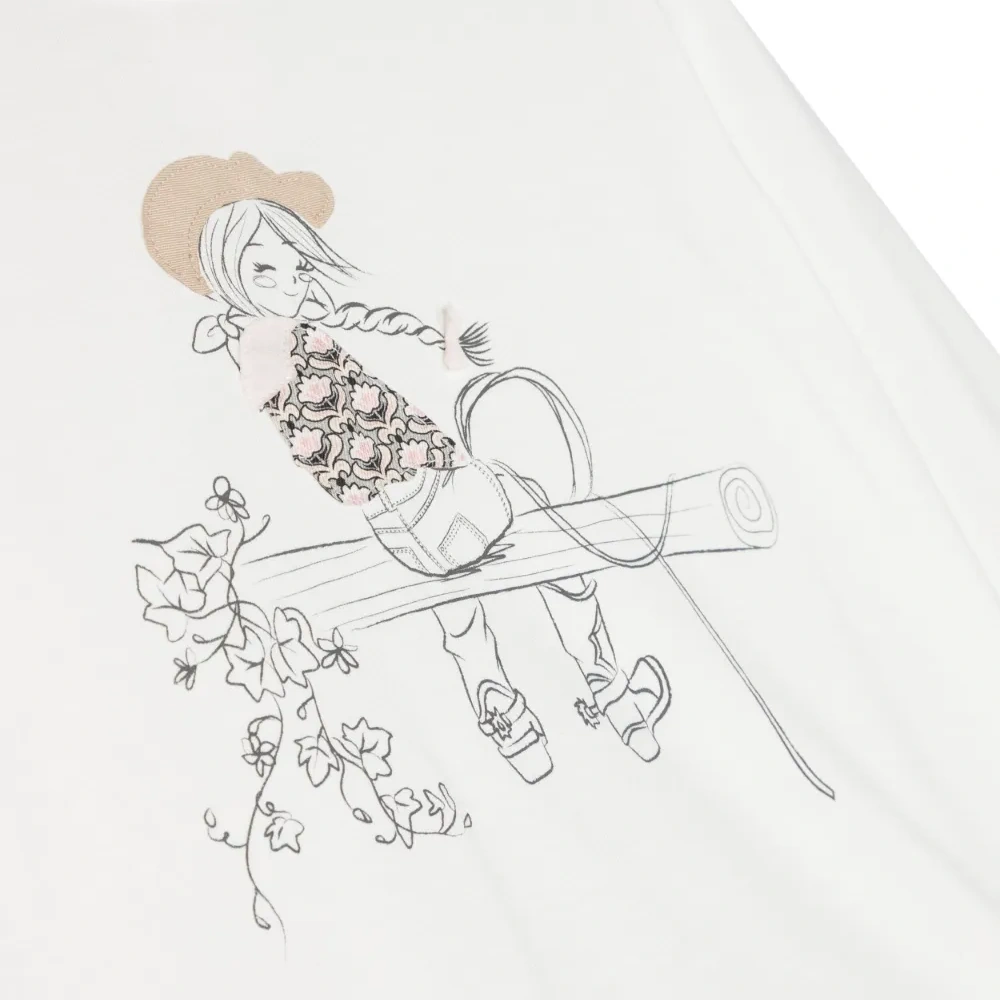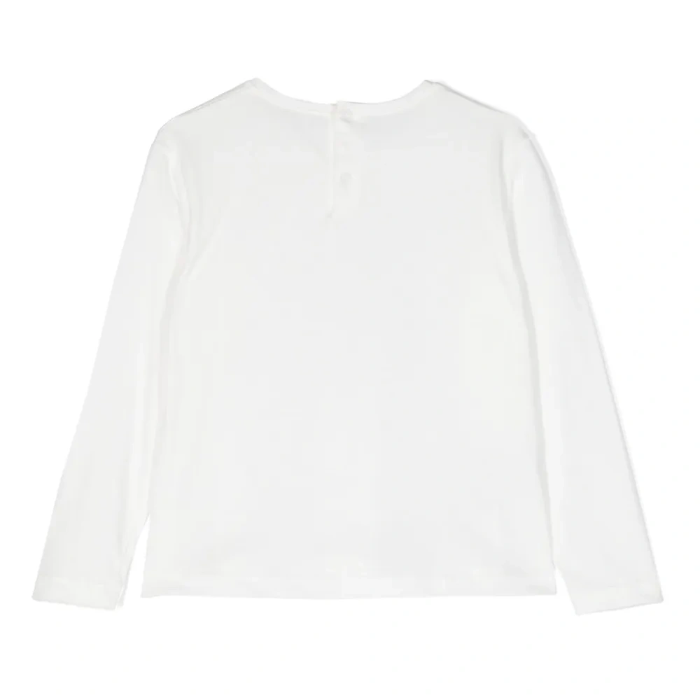 Белый, хлопок, ткань джерси, графичный принт спереди, круглый вырез, застежка на кнопках сзади, длинные рукава и прямой подол.