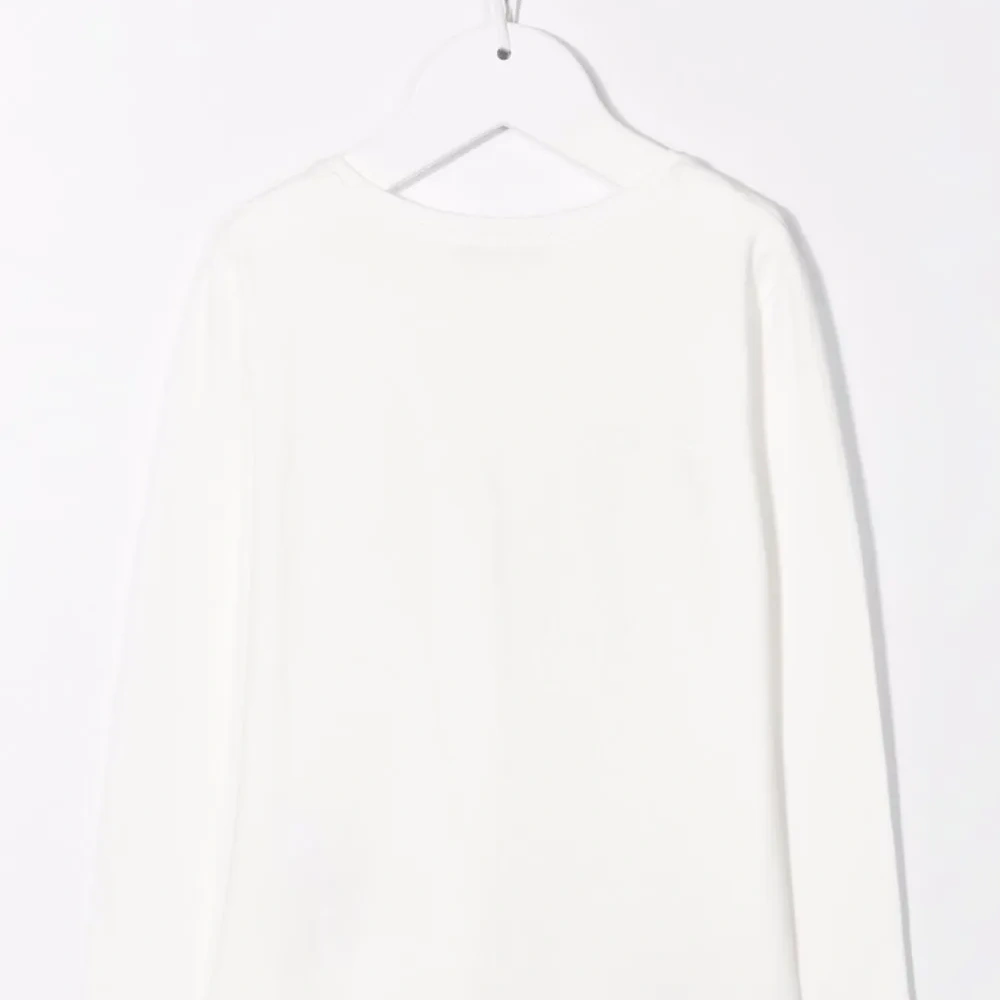 Принт на груди, круглый вырез, длинные рукава и прямой подол.