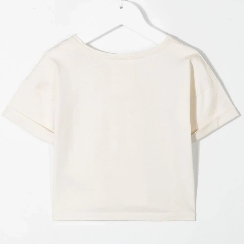 Принт на груди, круглый вырез, короткие рукава, прямой подол и укороченная длина.