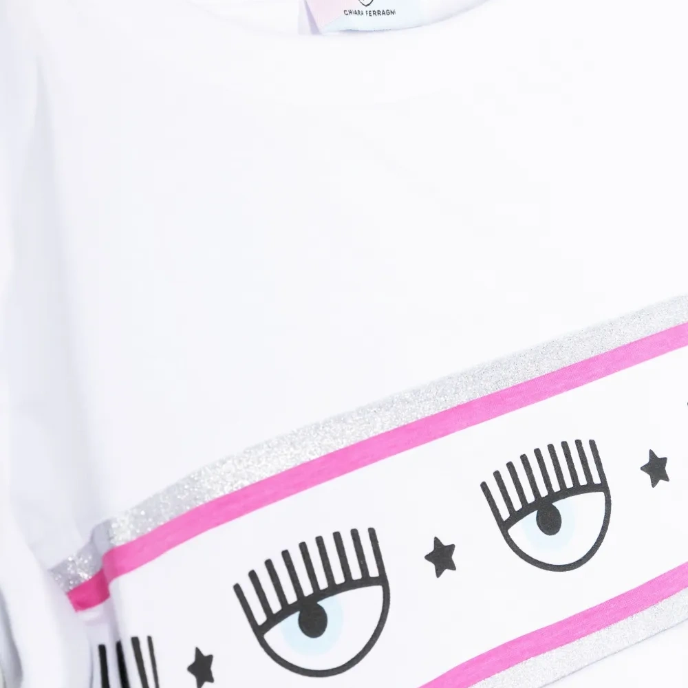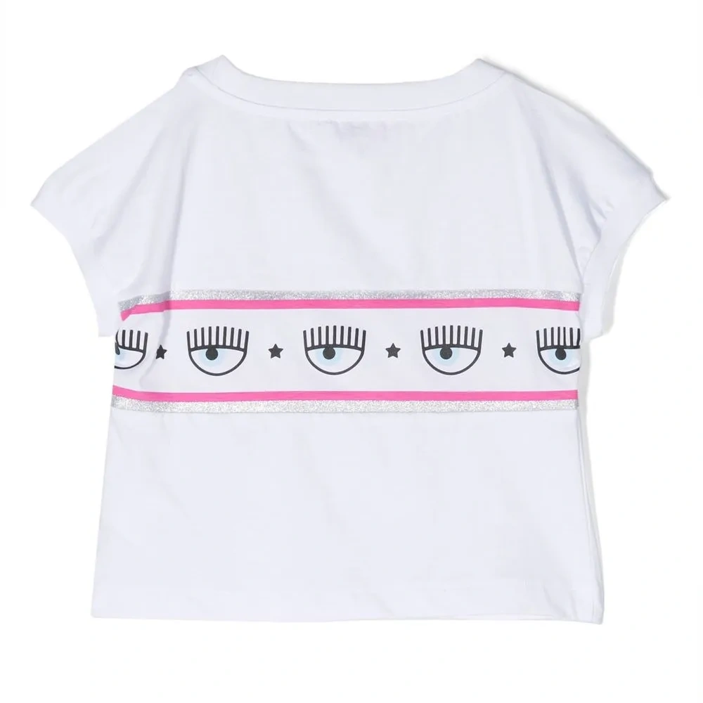 Белый, хлопок, сплошной принт с логотипом, круглый вырез, короткие рукава и прямой подол.