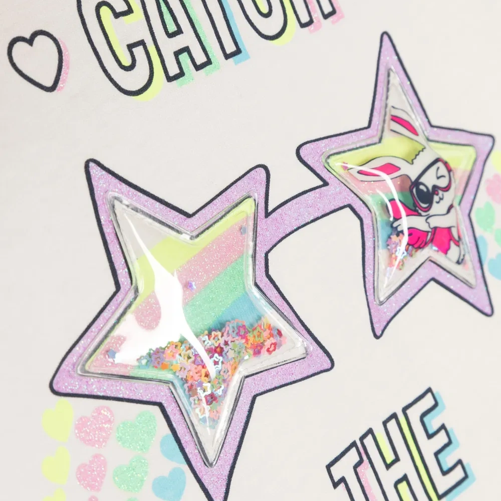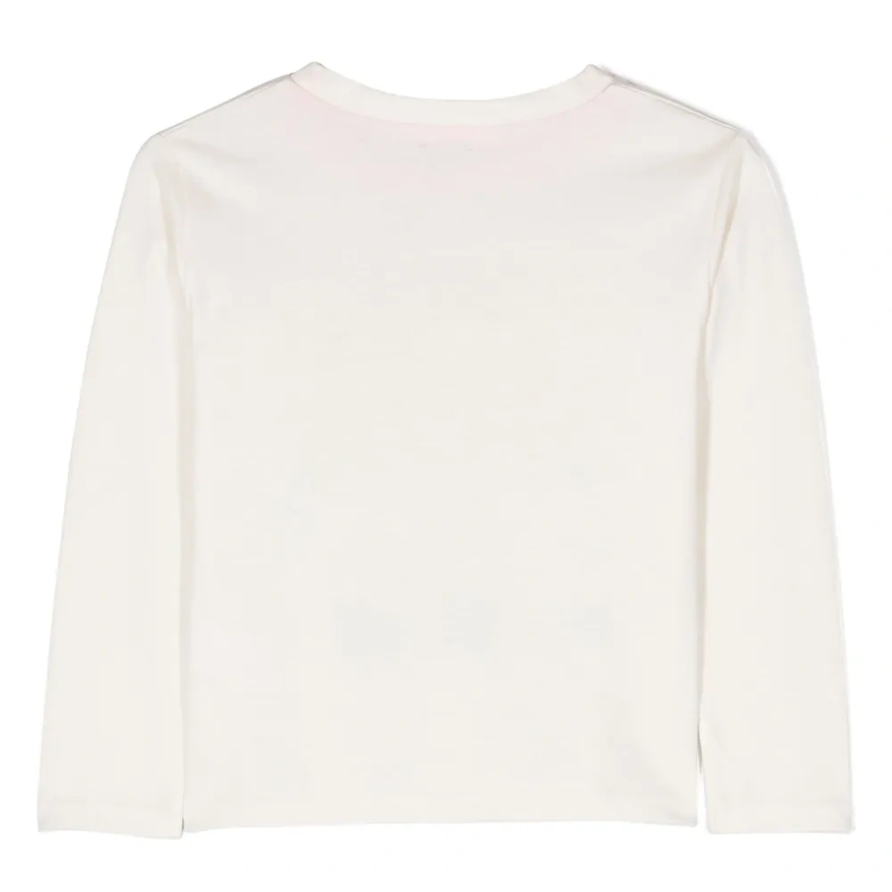 Цвет слоновой кости, хлопок, графичный принт спереди, объемная аппликация, круглый вырез, длинные рукава и прямой подол.