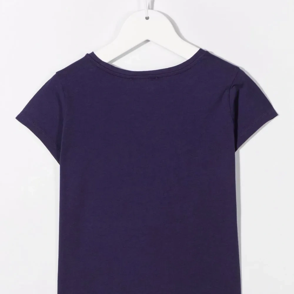 Принт на груди, круглый вырез, короткие рукава и прямой подол.