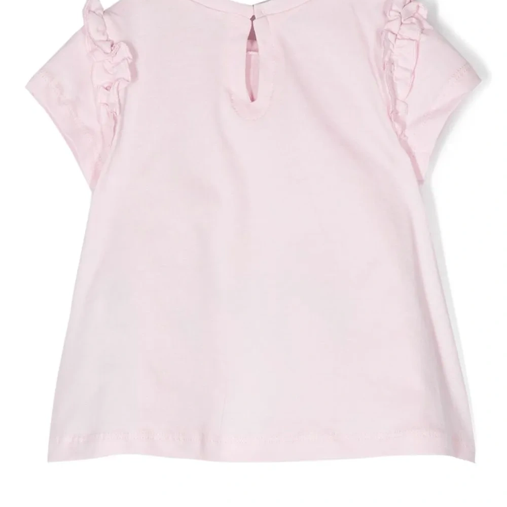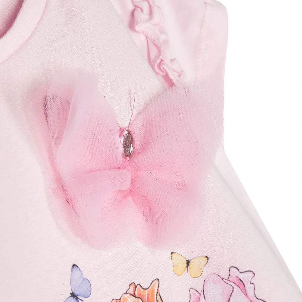 Розовый, разноцветный, хлопок, ткань джерси, аппликация, цветочный принт спереди, вставки с оборками, вырез сзади, короткие рукава, круглый вырез и прямой подол.