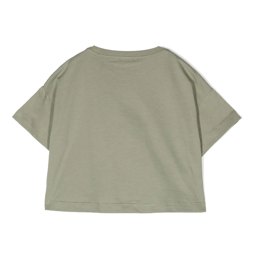 Светло-оливковый, хлопок, принт-иллюстрация, круглый вырез, короткие рукава, прямой подол и укороченная длина.