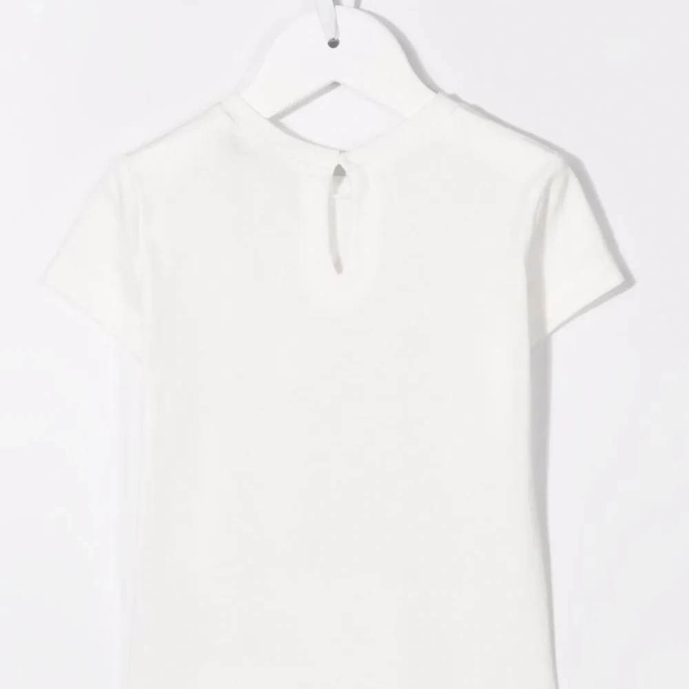 Принт с изображением плюшевого медведя, цветочный принт спереди, логотип спереди, принт с надписью спереди, круглый вырез, короткие рукава и вырез сзади. Цвет: белый.