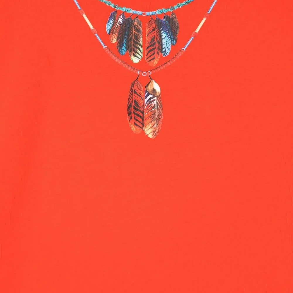 Красный, бахрома, принт с изображением перьев, круглый вырез и короткие рукава.