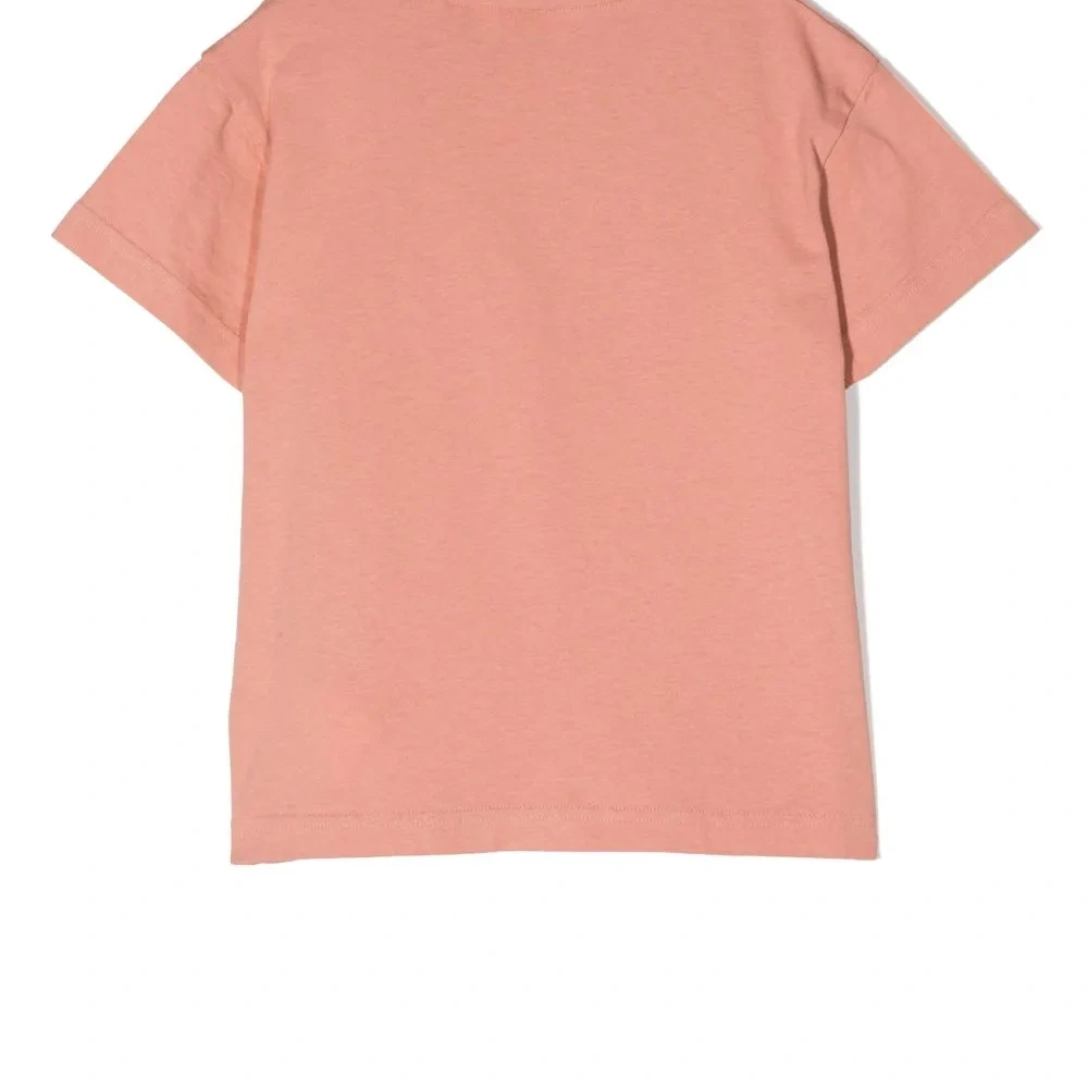 Персиково-оранжевый, хлопок, ткань джерси, графичный принт спереди, круглый вырез, короткие рукава и прямой подол.