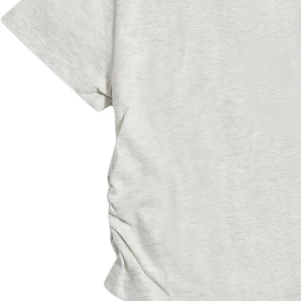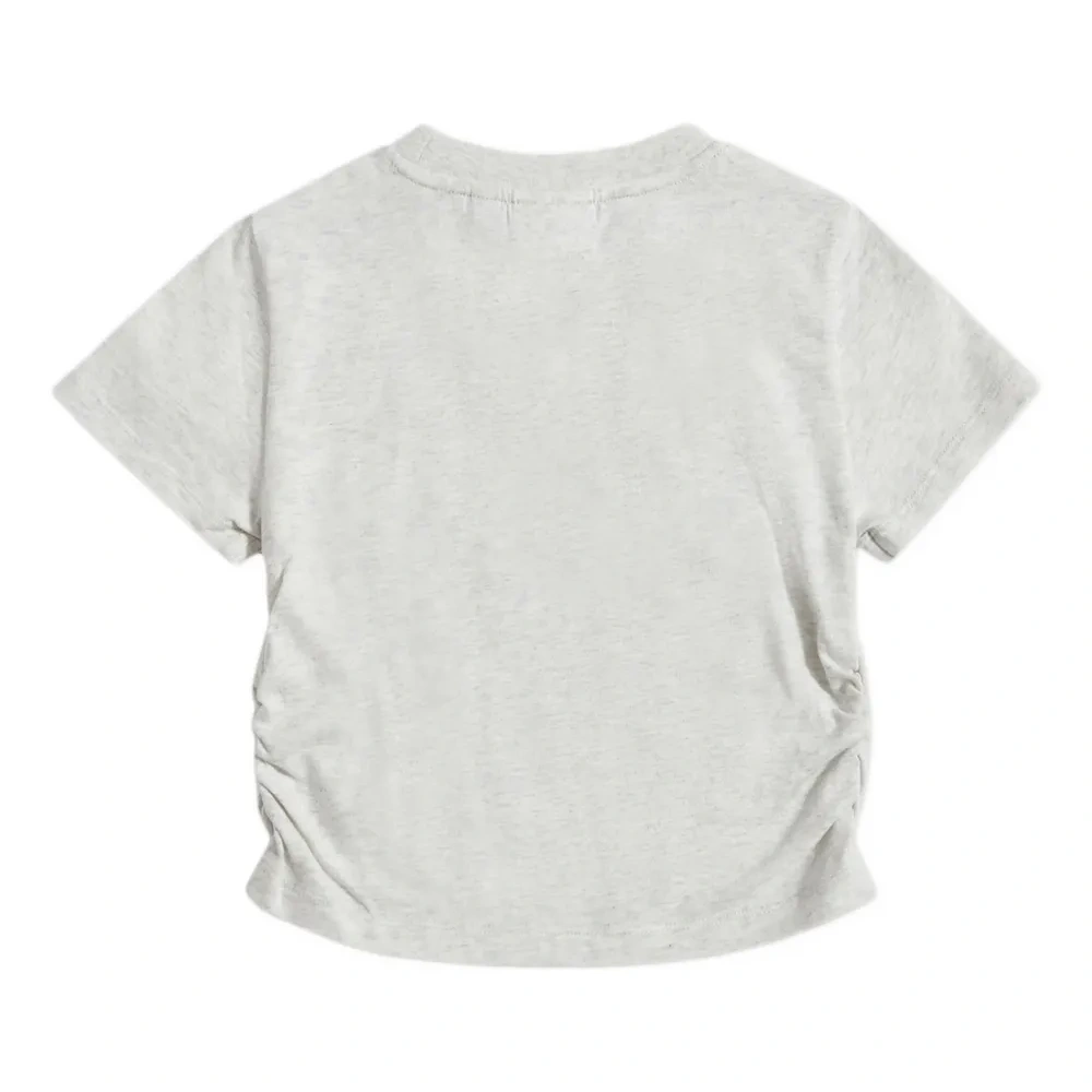 светло-серый хлопок короткие рукава сборки по бокам круглый вырез графический принт